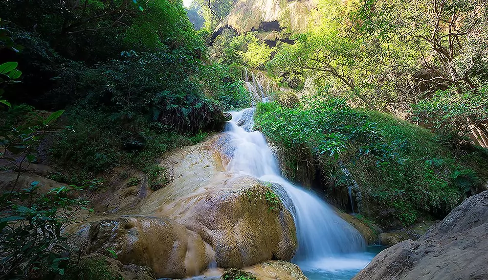 第六層Dong Pruk Sa(ดงพฤกษา ),小溪流自兩旁峭壁傾斜而下,濺起點點水花。