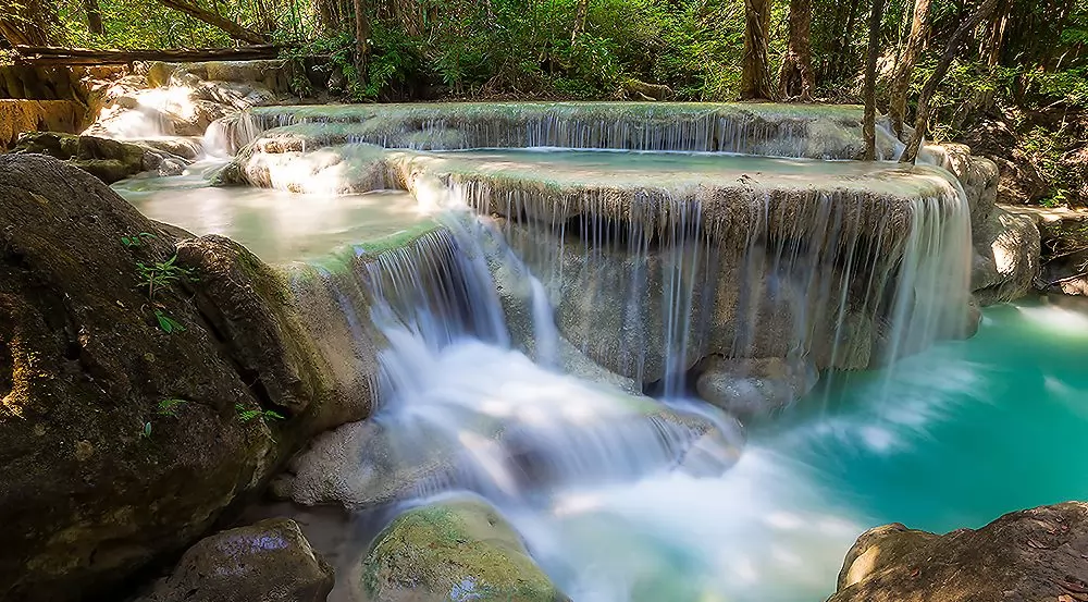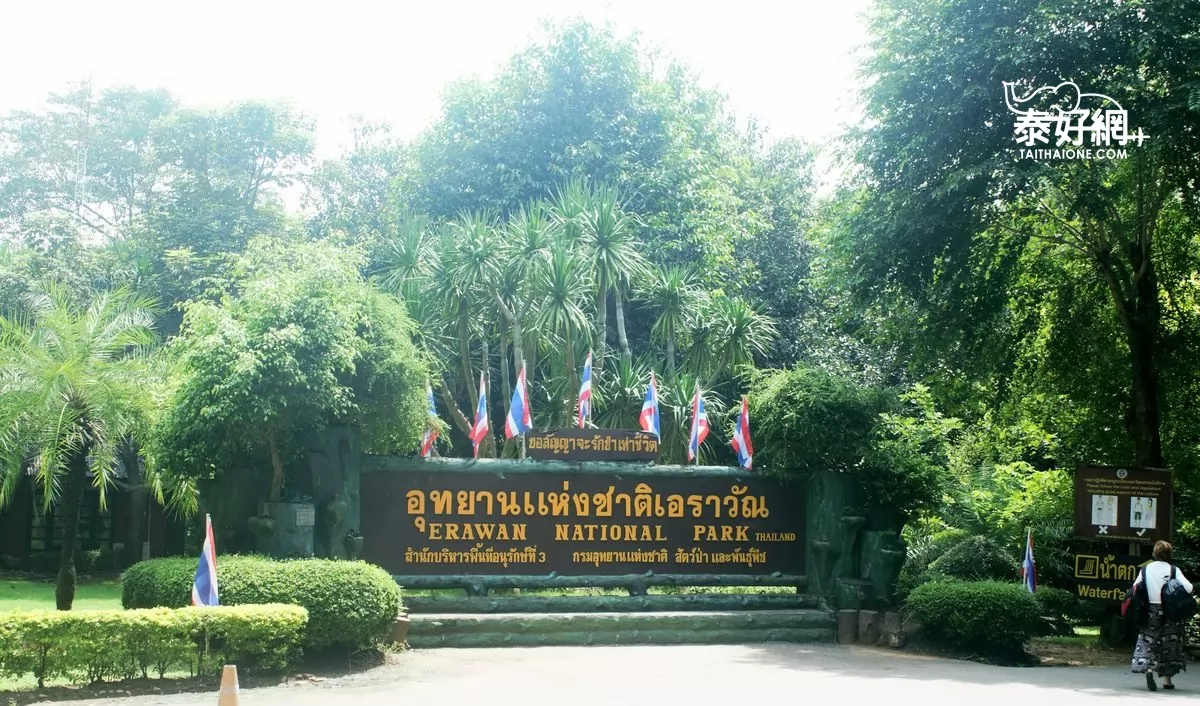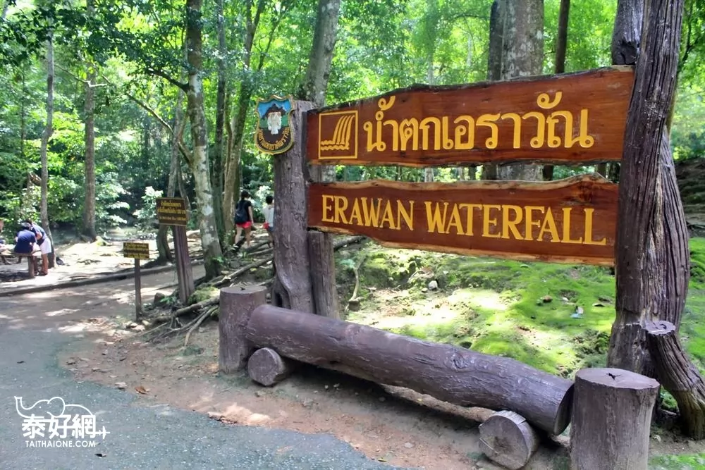 經過詩納卡琳(Srinagarin)水庫後,進入Erawan National Park,外國遊客門票200銖,可以向遊客中心索取資訊,順著瀑布的指標前進,國家公園有80%是森林,加上奇石怪岩,高低落差製造出7層大小不一的瀑布,經過日光反射,水潭的展現乳白、淡藍、翠綠等顏色,有如人間仙境,值得一遊。
