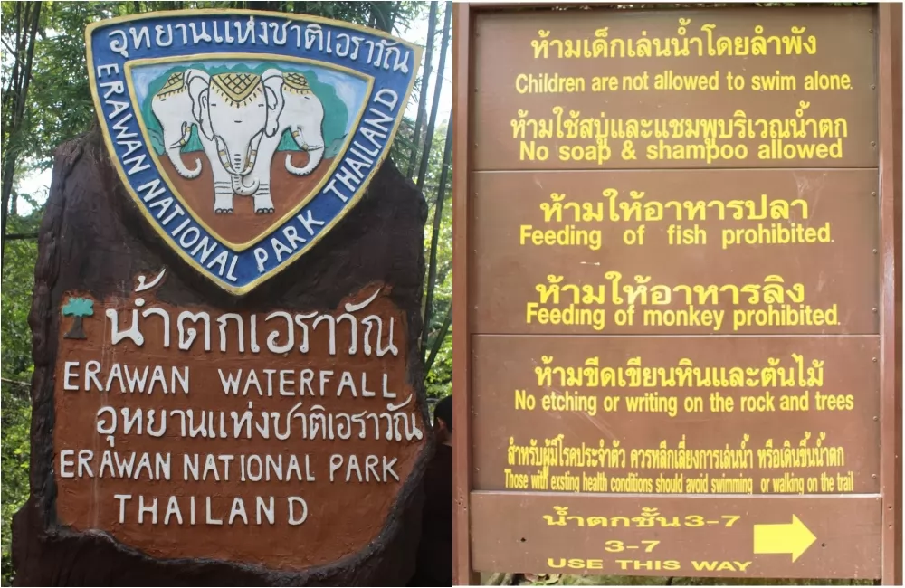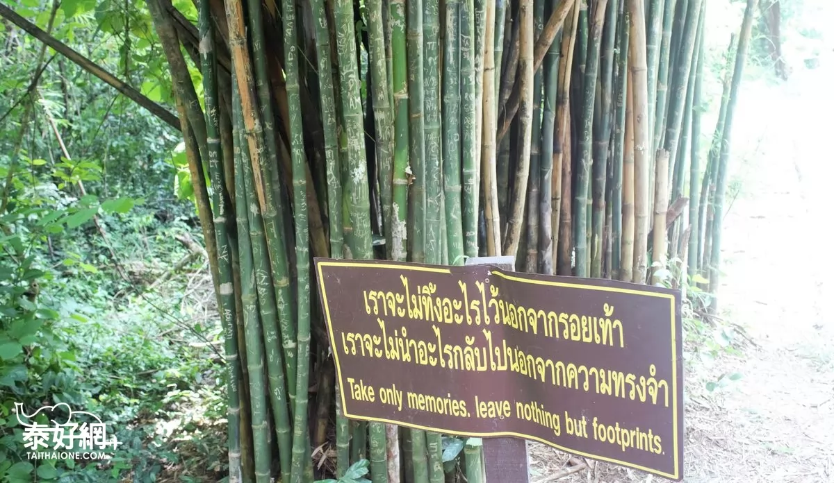 進入瀑布前的道路上,有招牌用泰文寫著「我們沒有丟棄什麼,只留下足印;我們沒有帶回來什麼,只留下美好的回憶」,只是旁邊的竹林卻留下到此一遊的刻痕,請大家不要跟著去刻劃,國家公園立牌禁止這樣做。