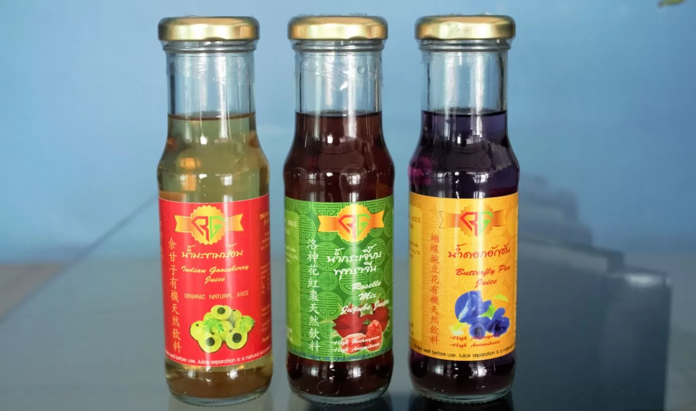 除了小玉米,Tanasaksiam的工廠也能製造很多種類有機的天然飲料,像是蝴蝶碗豆花有機天然飲料;洛神花紅棗天然飲料;余甘子有機天然飲料。