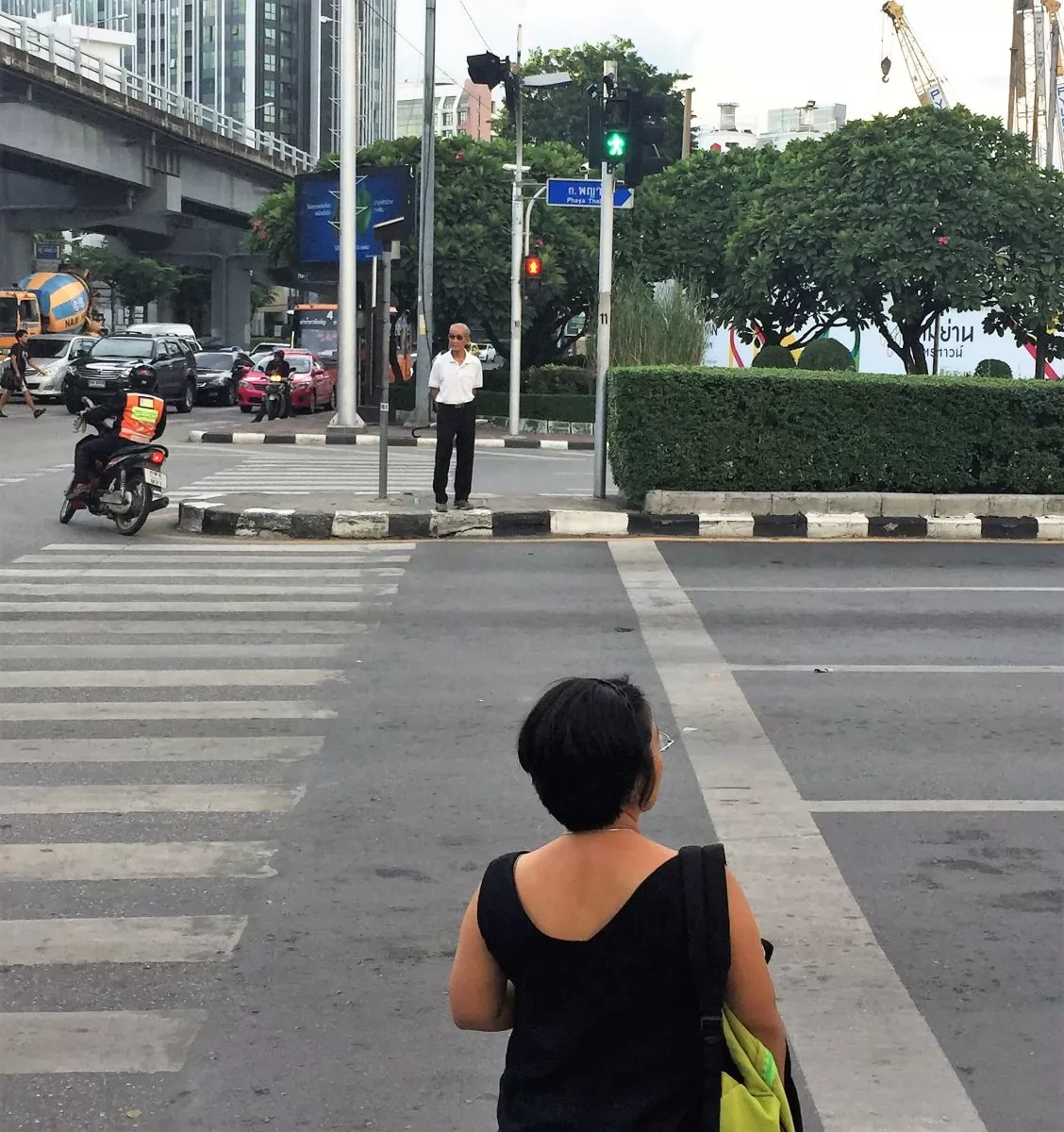 在曼谷,可不一樣喔!8線道(來回各4線)的大路,想要穿過,得要多注意,因為指示行人的綠燈是兩段式的,也就是說先過到中央分隔島停下來,等到對街的綠燈亮了,才能再通過,如果沒注意,又邊滑手機,出車禍,怪不了別人。