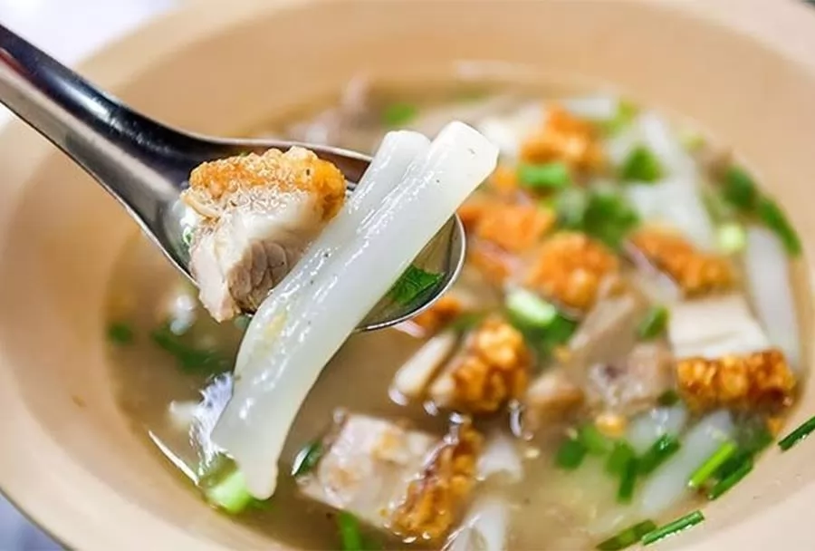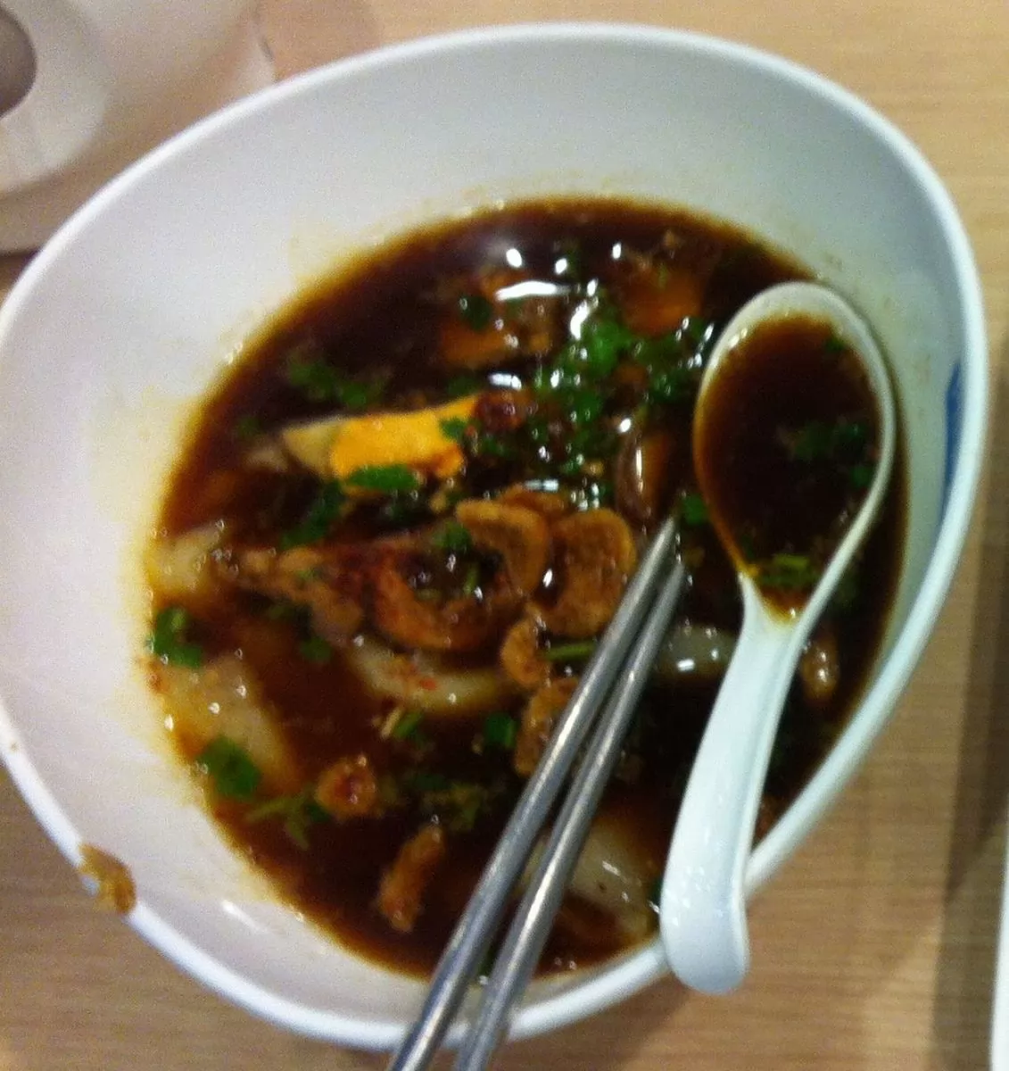 用各種豬內臟為料(豬肝、豬腸、豬肚…等),配上油豆腐、水煮蛋,以及半透明的粿片而成的特殊食物,比較恰當的說法應該是豬雜粿片湯!