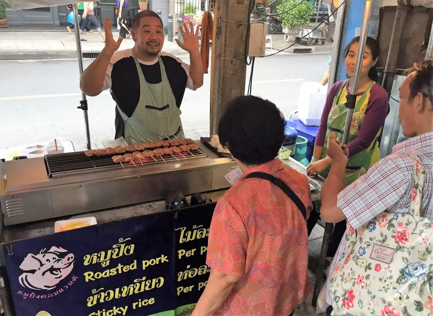 曼谷西隆(Silom)路旁的Convent路口附近,有位胖哥就是買烤豬肉,人氣很強,邊烤邊與顧客聊天,他的烤肉也不錯吃!也有賣糯米飯,值得去嚐嚐!