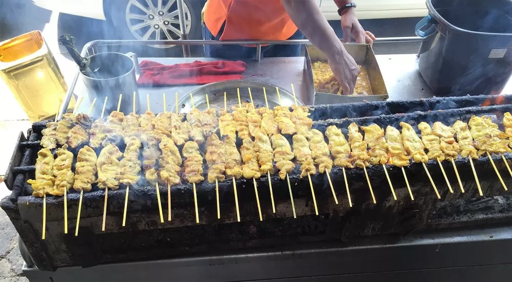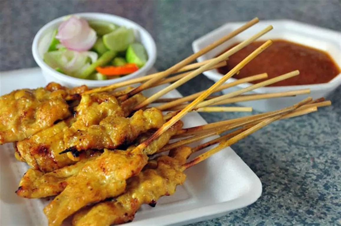 沙嗲豬肉串(หมูสะเต๊ะ)在泰國路邊攤往往是賣得最好的。類似馬來西亞的沙爹,只是差別在豬肉以及沾料,豬肉是切片成串,雖然是烤的成,但它的口味其實很清淡,非常適合泰國這種炎熱的氣候裡食用。