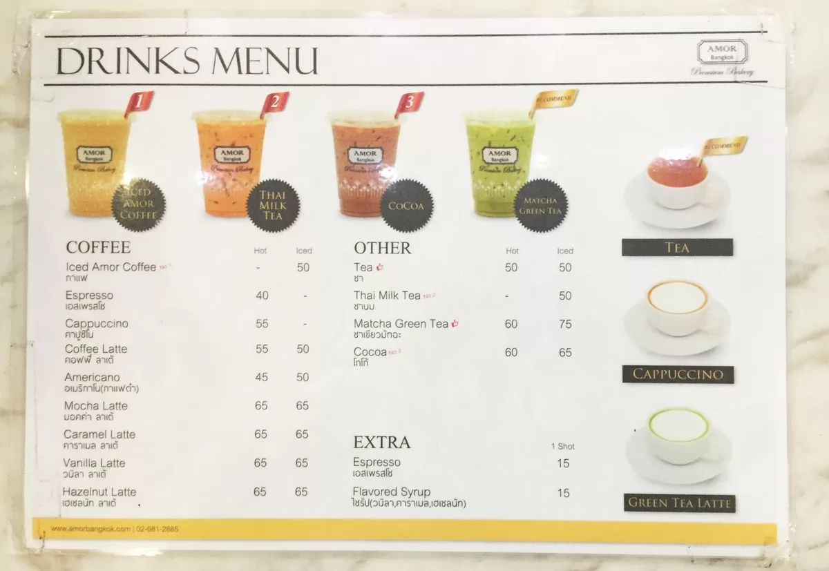 除了蛋糕之外,也有咖啡、泰式奶茶和可可及抹茶口味的飲料,妖妹要推薦的是冰咖啡、冰泰式奶茶和可可(Cocoa),這是熱賣的前3名,冰拿鐵也是不錯的選擇,雖然不是頂級好喝,但它只要50銖,比其他咖啡店要便宜30銖左右。