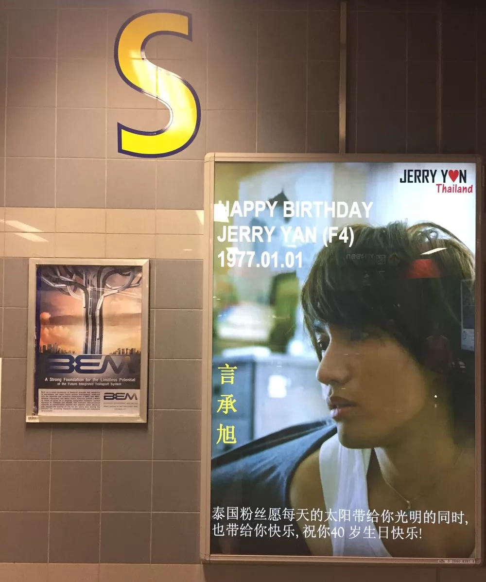台灣著名的偶像劇《流星花園》,讓F4風靡亞洲,也紅到泰國,很多人都認識「道明寺」,言承旭(Jerry) 元旦過40歲生日,泰國粉絲團「Jerry Yan Thailand」竟然買下曼谷地鐵Silom(西隆)站的廣告,為偶像慶生。