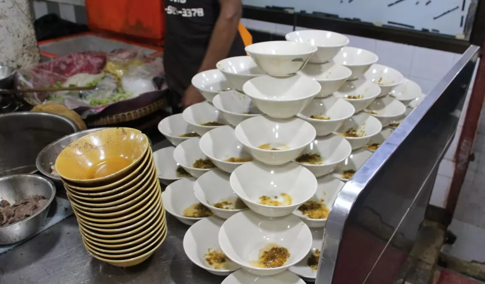 因為1碗只要12銖,份量不多,加上好吃,讓你會一碗加一碗,吃到最後,連女生前面的碗都疊得高高的,不必害羞,一定還有其他人吃的比這更多。