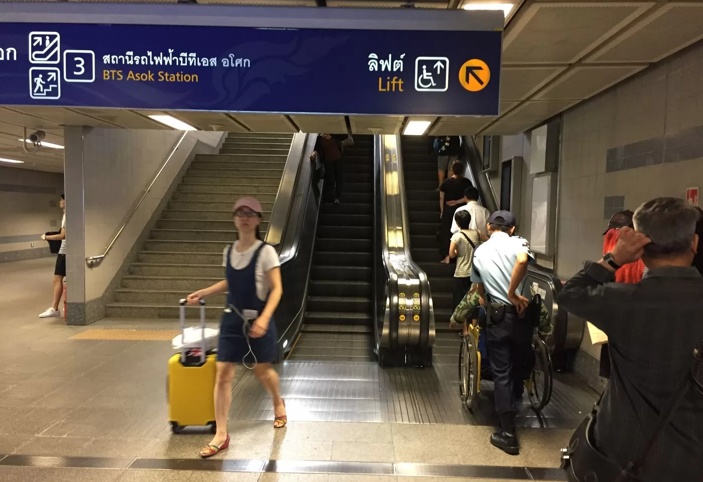 舉個例子,MRT和BTS的電扶梯就不同步,MRT的SUKHUMVIT站出來,電扶梯往上是靠左,上來後接BTS的ASOK站時,電扶梯卻是靠右,不小心就出糗!