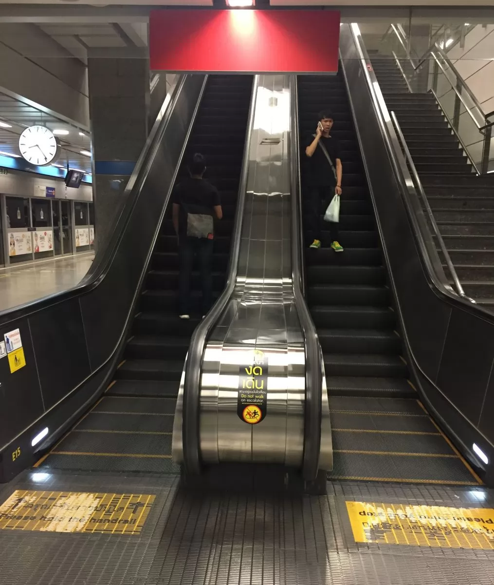 台灣電扶梯大多是右上左下,曼谷的電扶梯往上是靠左?還是靠右?答案是左右不分啦!