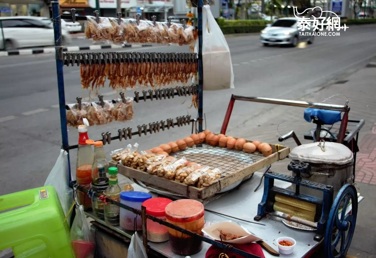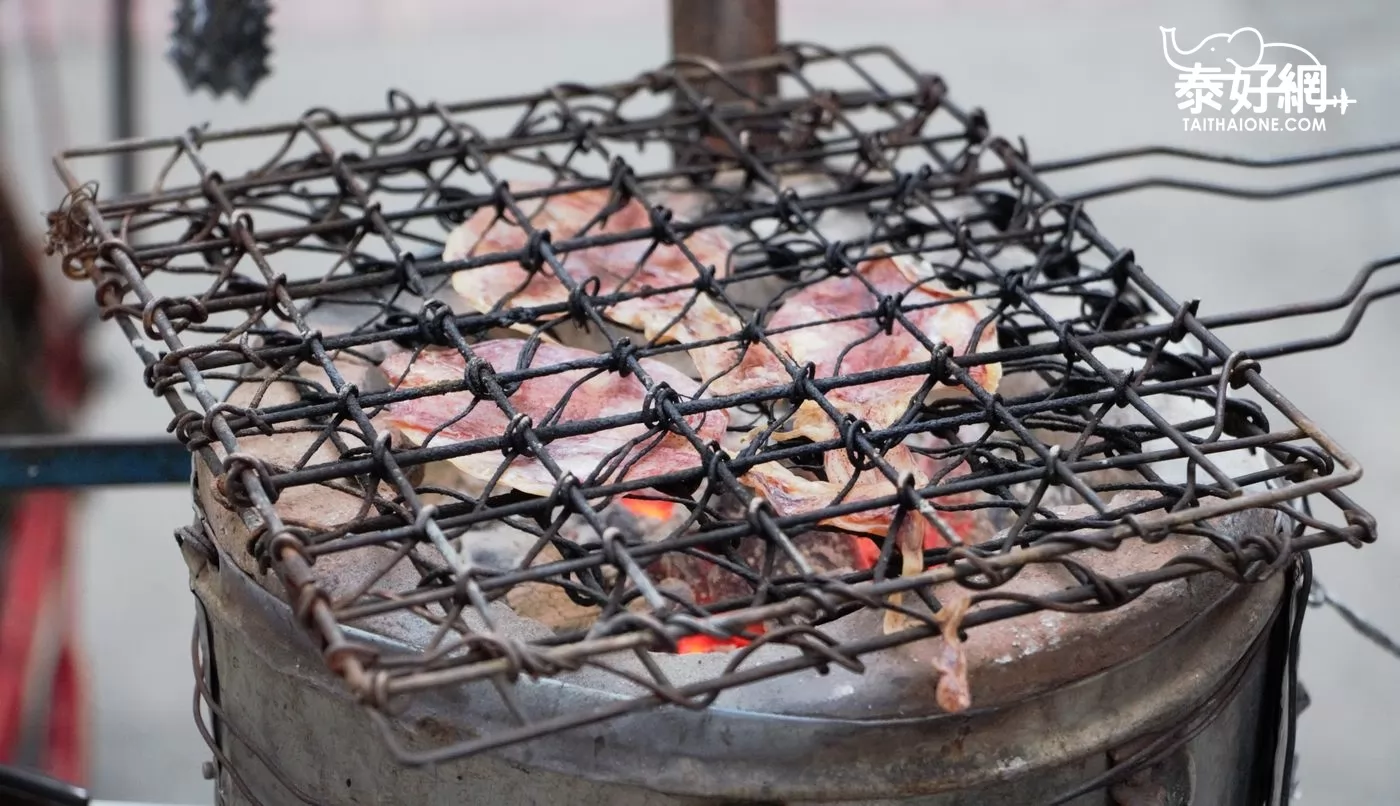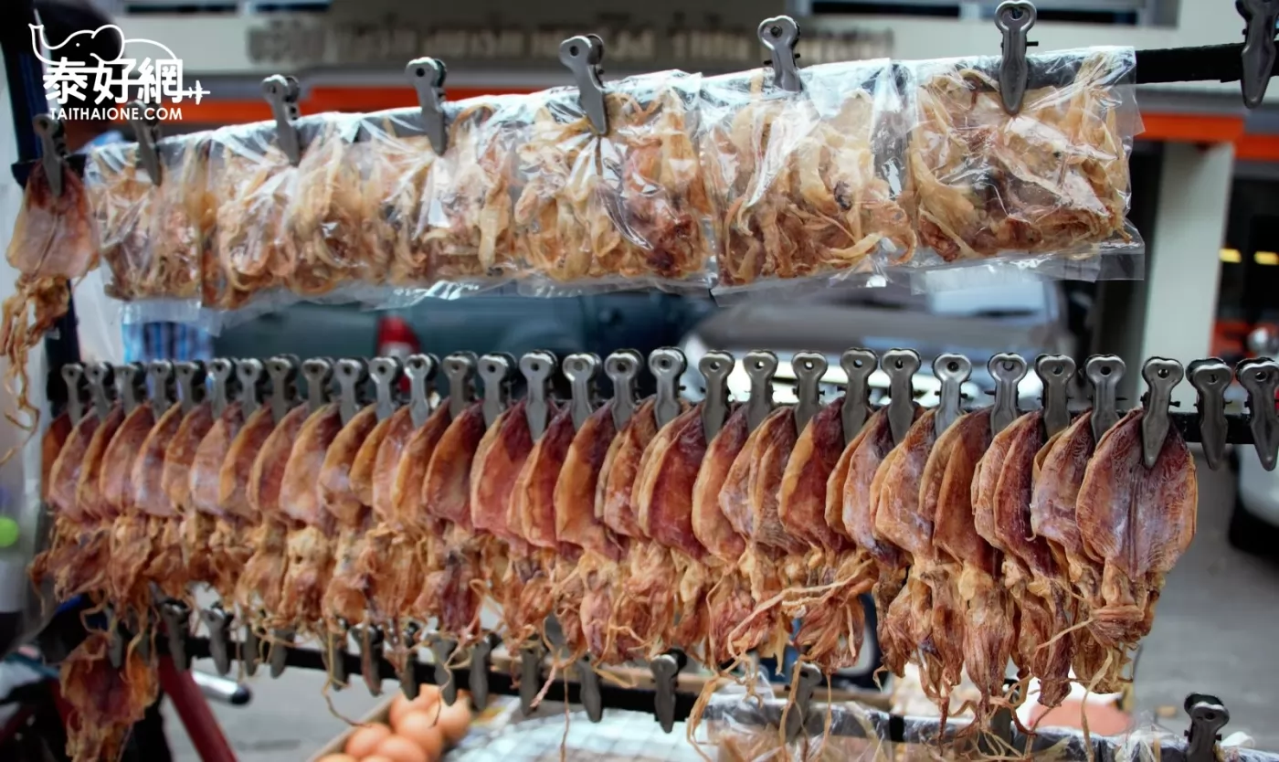 燒烤的魷魚乾香味散發在空氣中,烤好後,客人可以要求切片,然後配上泰式辣醬、碎花生甜醬,吃起來比較鬆,而且越嚼越香,口感要勝於包裝的魷魚乾好幾倍,價錢卻便宜一倍多,小的1隻7到10銖,成人手掌大的約30銖。