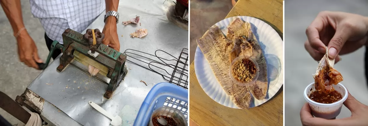 在台灣很難吃到現烤的魷魚乾,走在曼谷的街上,會發現有人騎著或推著改裝的3輪腳踏車,四處兜售烤魷魚(ปลาหมึกปิ้ง),發音PlaMeuk ping(霸沒丙)。