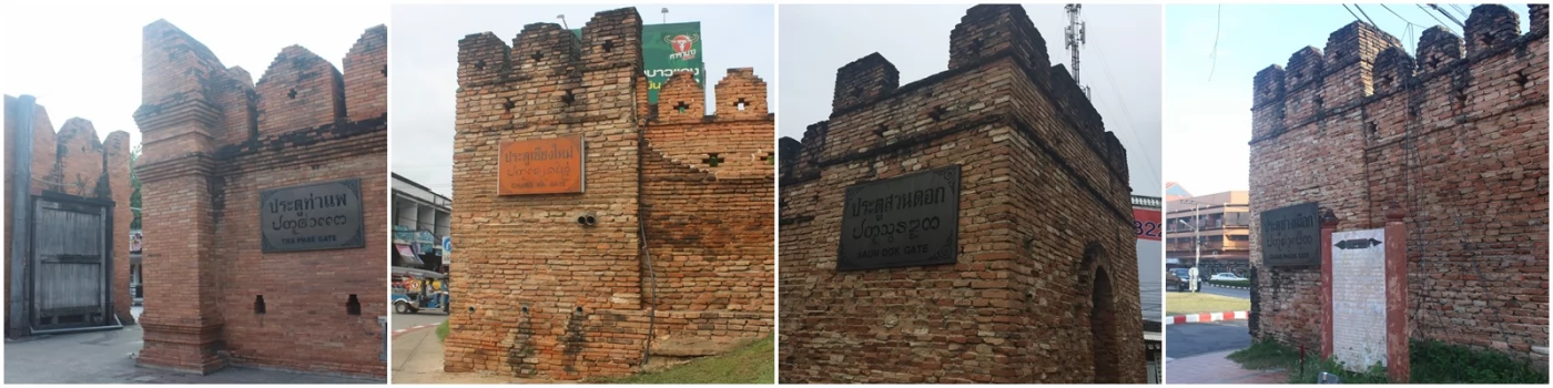 隨著歲月流逝,目前還有四個城角遺跡以及5個城門遺跡,分別是東邊的塔佩門(Tha Pae Gate)、北邊的白象門(Chang Pauk Gate)、西邊的松達門(Suan Dok Gate)以及清邁門(Chiang Mai Gate)和松蓬門(Saen Pung Gate),原來5門並不對中,城內的路也不是橫豎分明。