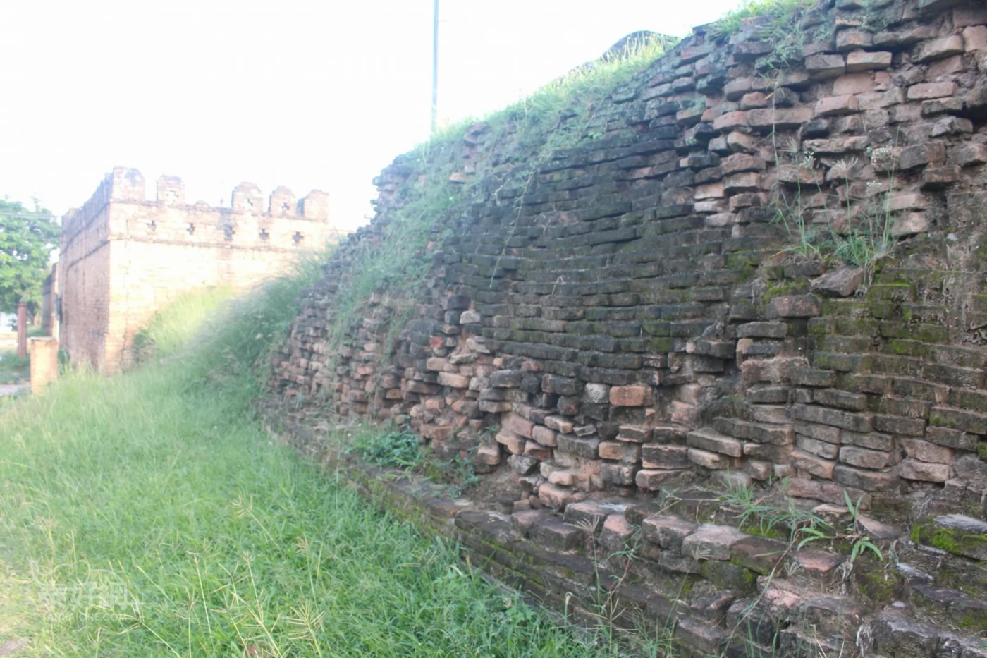 城池四周本有圍成方形的護城河,當時的人們就用造護城河時挖出的泥土修建城牆,然後壘上磚塊,頂端做成佛寺界碑的形狀。