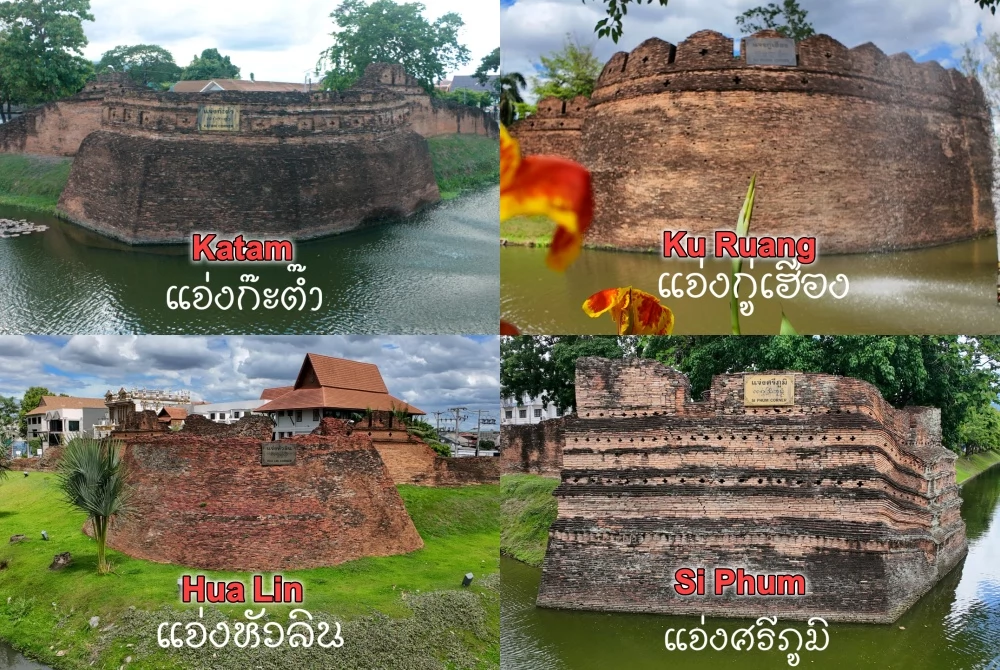 古城的四座角堡,東北:Si Phum;東南:Katam;西北:Hua Lin;西南:Ku Ruang。如今,還可以看到一些歷史殘留的古城牆遺跡。