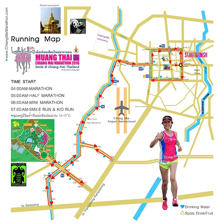 跑步路線的起點為清邁古城著名景點:塔佩門。出發之後繞半圈古城後外城外跑,河兩邊的道路折返回古城,在繞另外半圈古城後回到塔佩門。途徑眾多歷史古跡,皇家植物園。