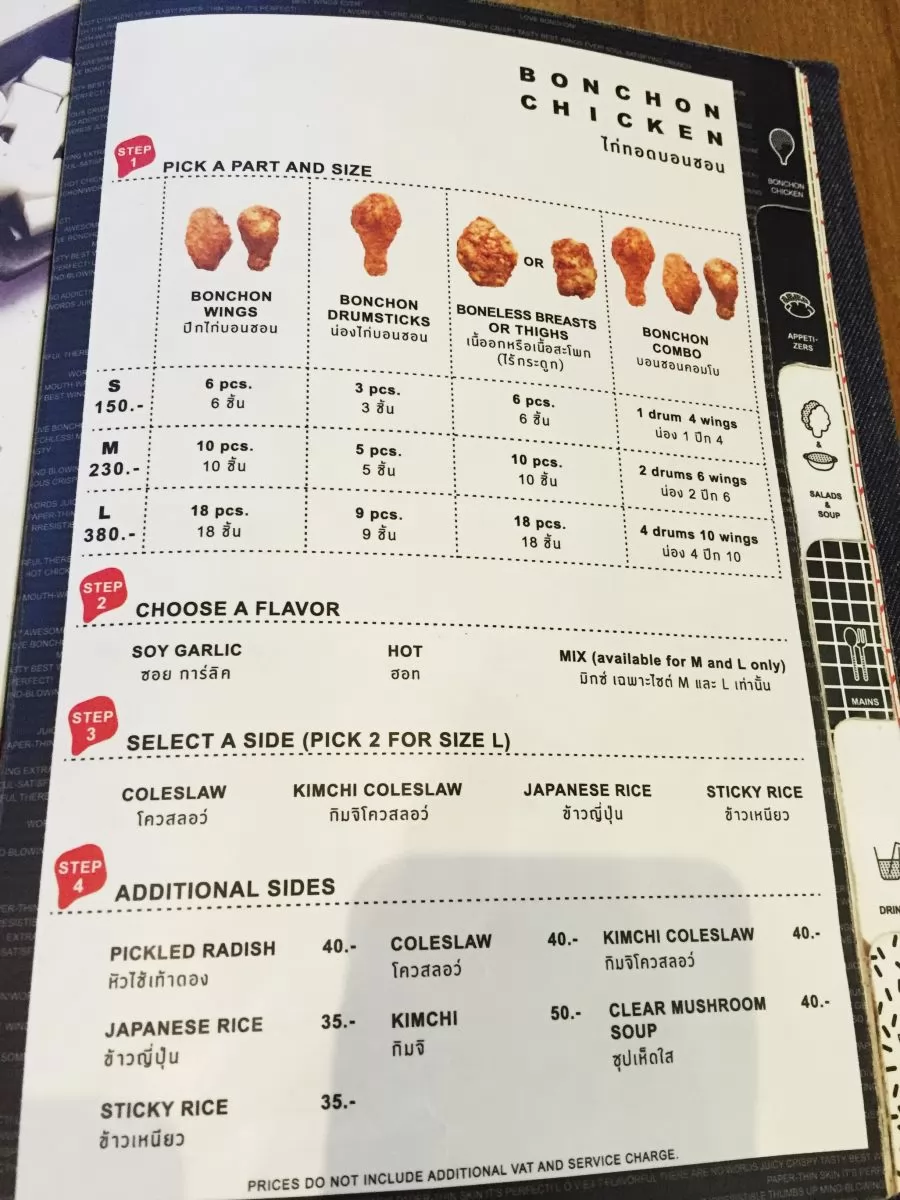 泰國人喜歡吃炸雞(配糯米飯),Bonchon的賣點正是炸雞,特有的炸雞配方,口味與當地炸雞不一樣,加上韓國獨特的辣醬,對了泰國人的口胃,自然暢銷,目前曼谷至少有8家分店(都在熱鬧的商場)。
