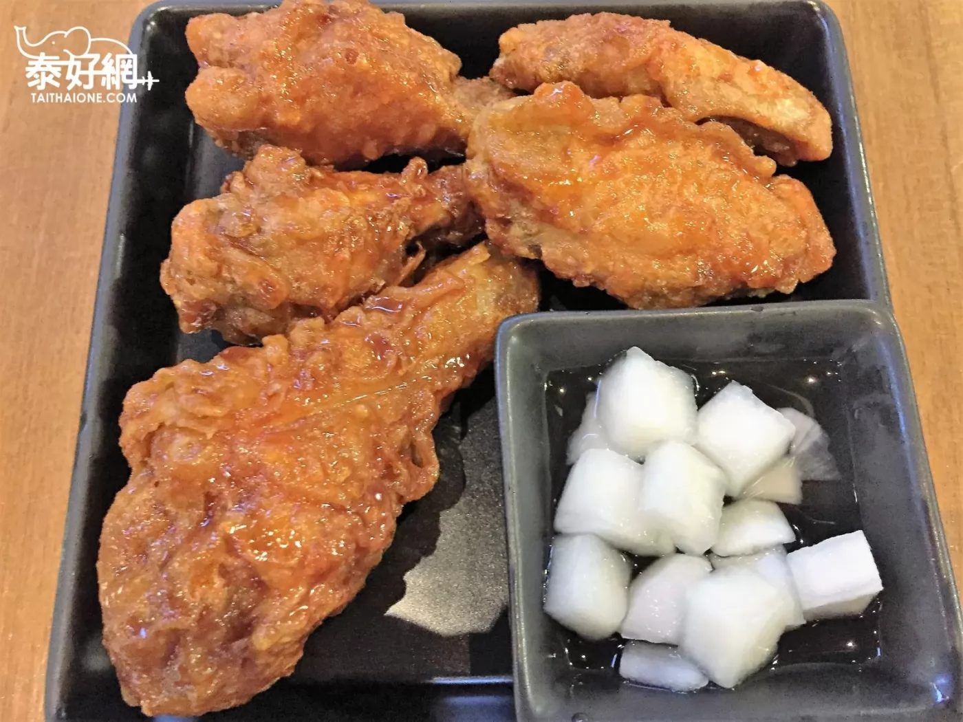 除了5塊炸雞,還附上白蘿蔔沾醬菜(另有泡菜),解油膩!