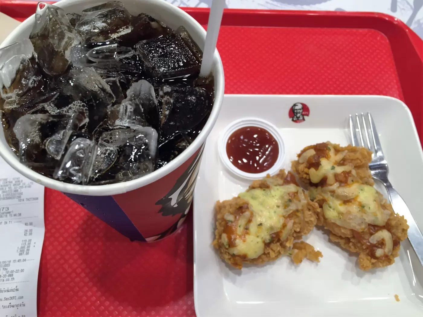 推廣期間,1塊39銖(平時42銖)、4塊特價139銖(平時156銖),如果下午茶時間,兩塊起司炸雞+1杯可樂(113銖),剛剛好。