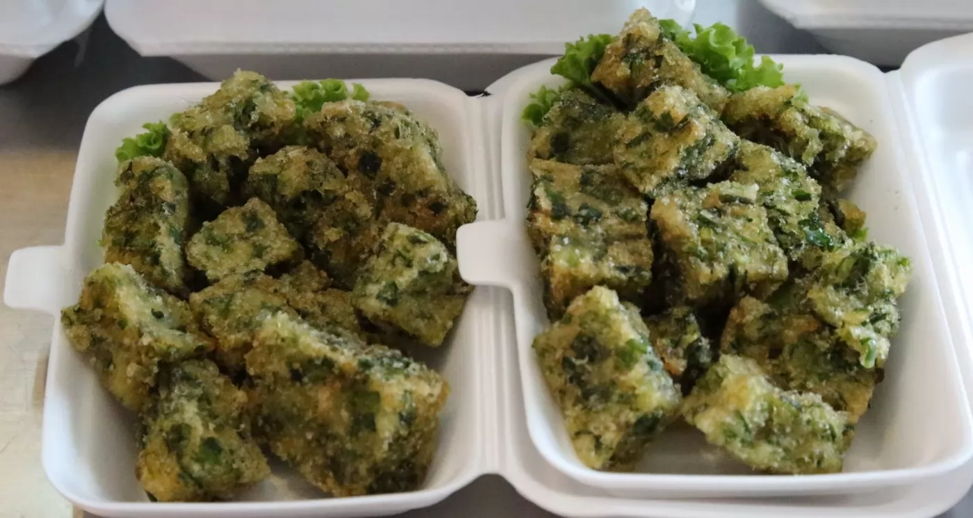 另一款韭菜粿是四方形沒皮的,一般都是煎來吃。它吃起來就是炸韭菜的感覺,還可以淋上特製的醬料,越嚼會越有一種辣感。
