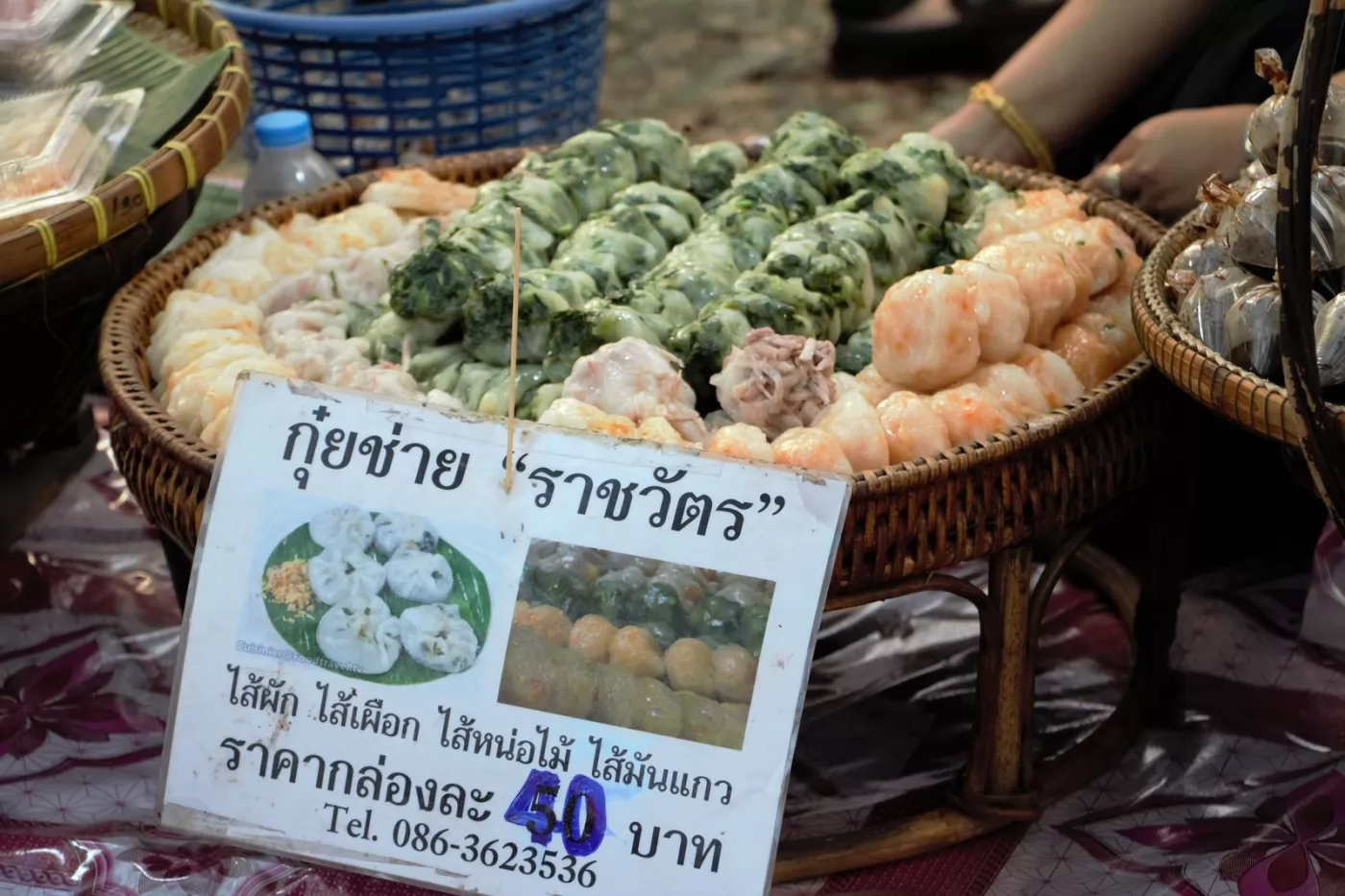 韭菜粿(khanom kuichai)在泰國有很多種作法,可以蒸,也可以煎來吃!除了韭菜餡,還有筍、芋頭餡。