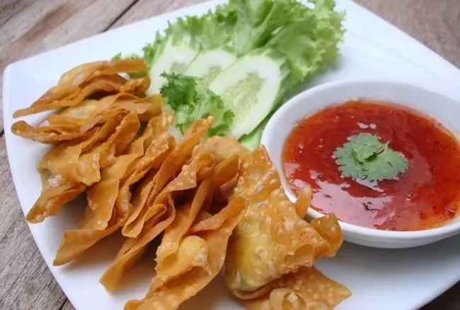 油炸餃子與台灣的餃子相比,它的特別之處在於用料上,魚露這味調料可以說是泰國人最愛調味之一,更讓這道油炸餃子突顯出泰國食物的特色。