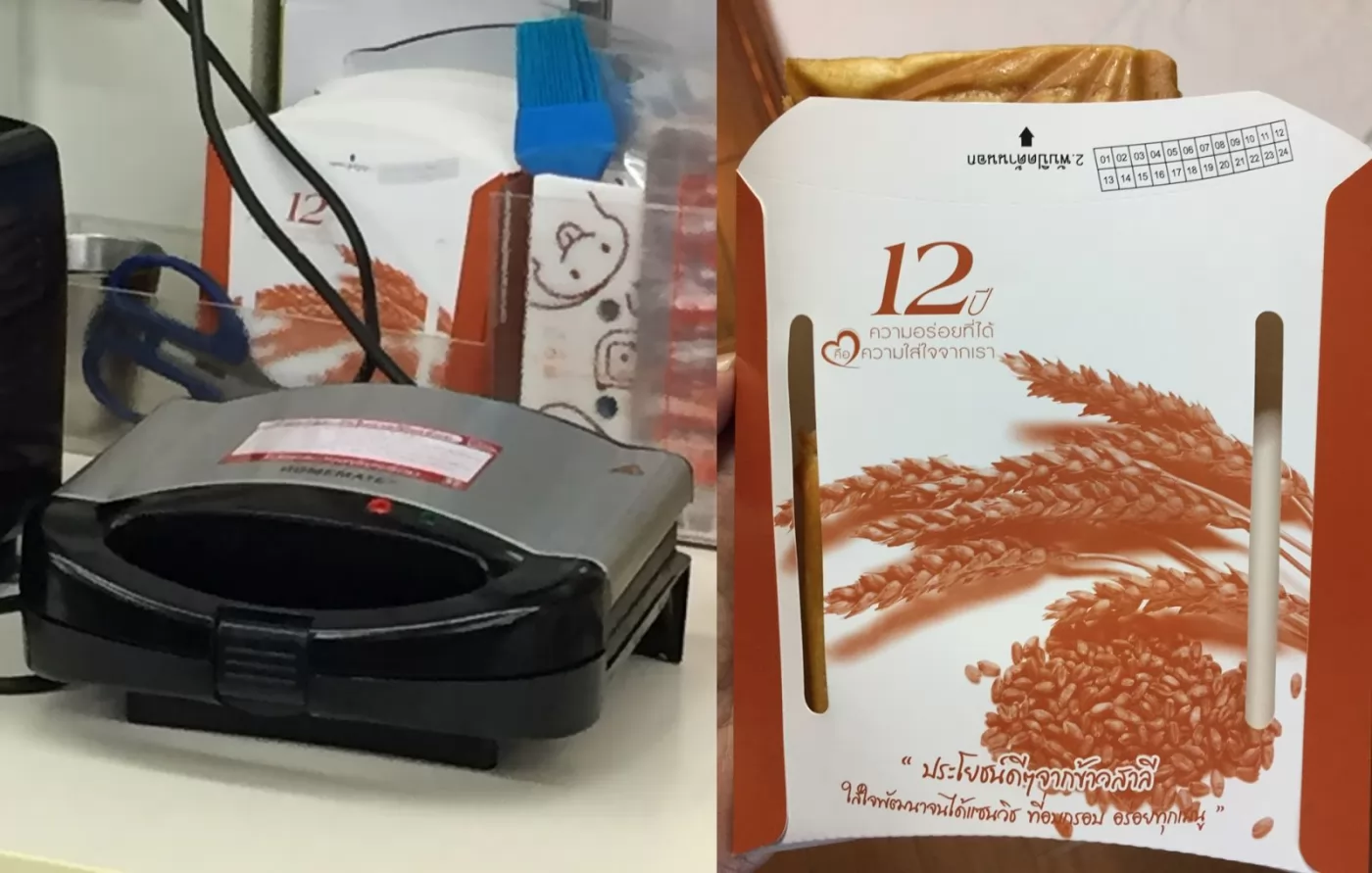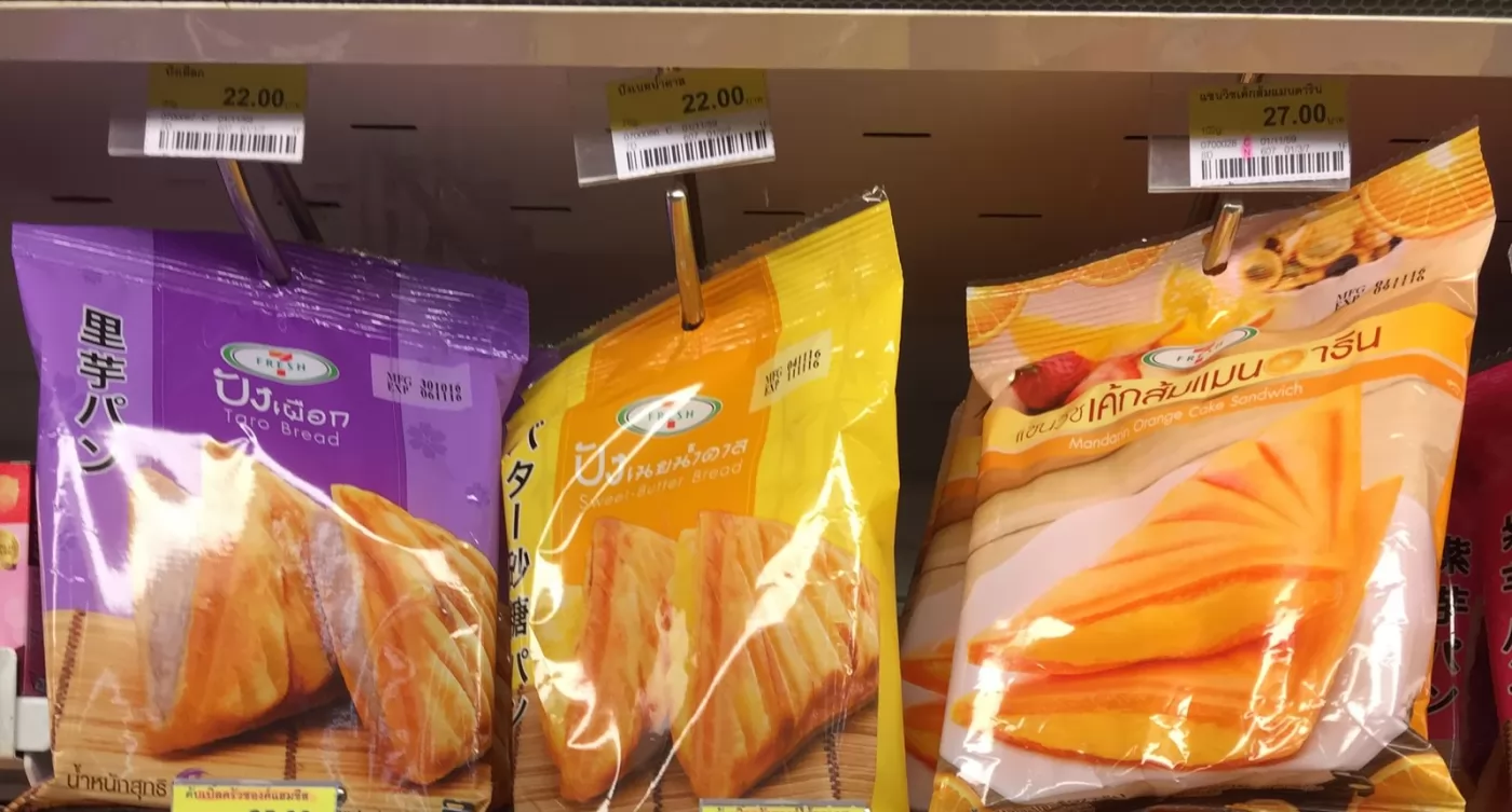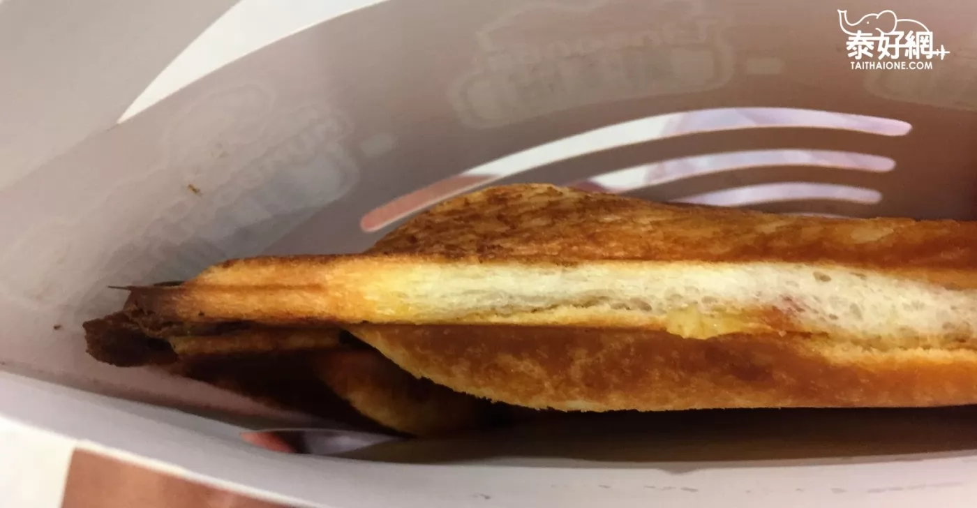 妖妹選好所要的起司口味(27銖)去結帳,店員會詢問要不要加熱,當然是要,他們拆開包裝,放到熱壓機加熱,5分鐘左右,取出來裝入紙袋,妖妹拿在手上,感受到三明治的熱度,咬下去,酥酥脆脆的外皮,加上溢出的鬆軟起司,蠻好吃的!很難想像它是台幣30元不到的銅板美食。