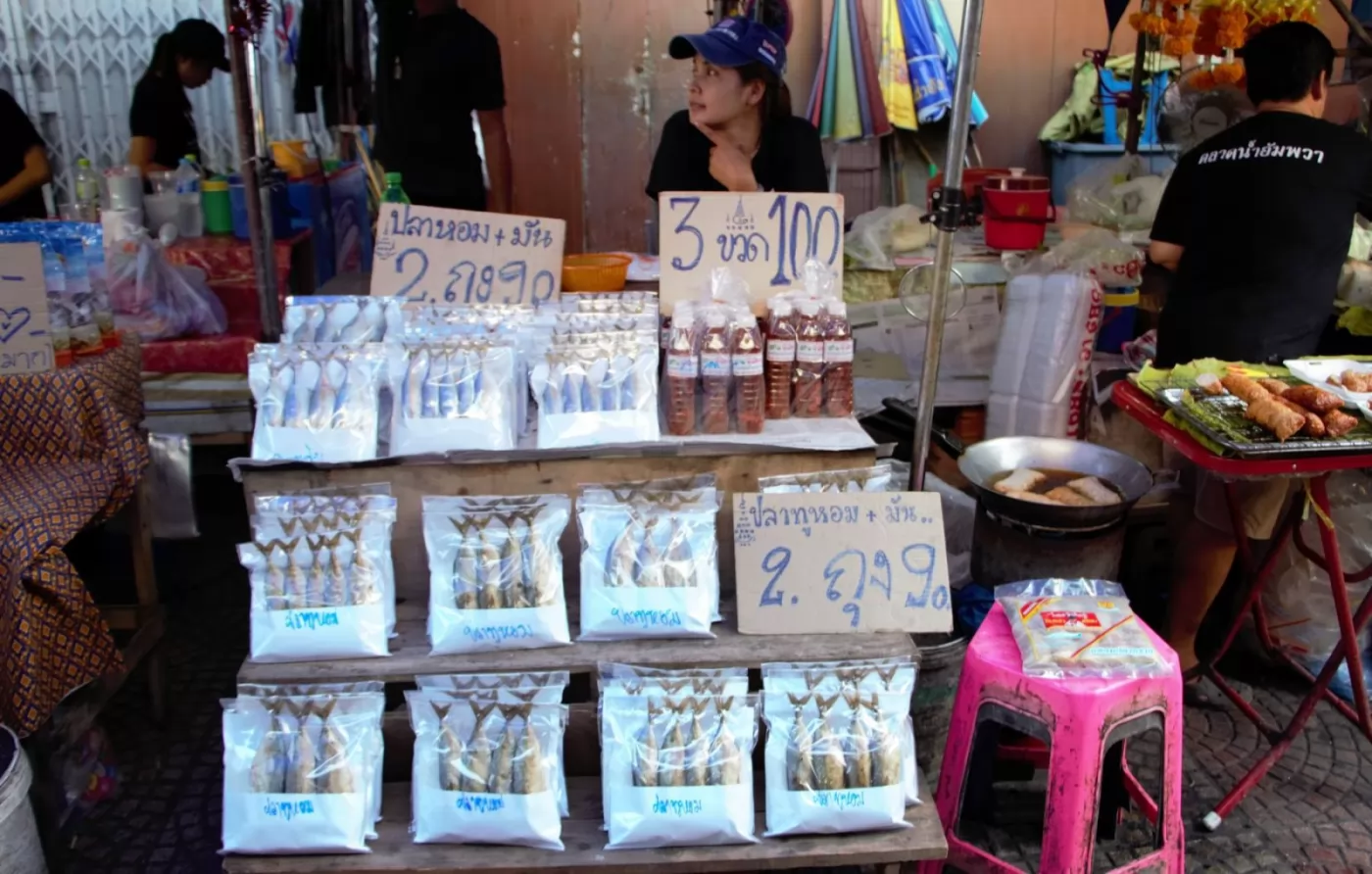 走在安帕瓦河道兩岸或市場的攤位上,不難找到「巴土魚」的身影,有的是放在竹盤上(兩尾像太極一樣的擺放),一盤35銖左右;有的是把魚處理好,包裝成袋(4條魚)販賣,2袋90銖,很便宜吧!