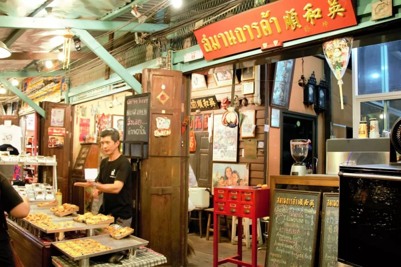 現在接手的年輕老闆已是第3代,他表示當年阿公就是賣咖啡,正宗的泰式古味咖啡和奶茶,闖出了名號,當時王子的元配和施琳通公主到訪安帕瓦時,都曾慕名而來光顧,照片也懸掛在店裡。