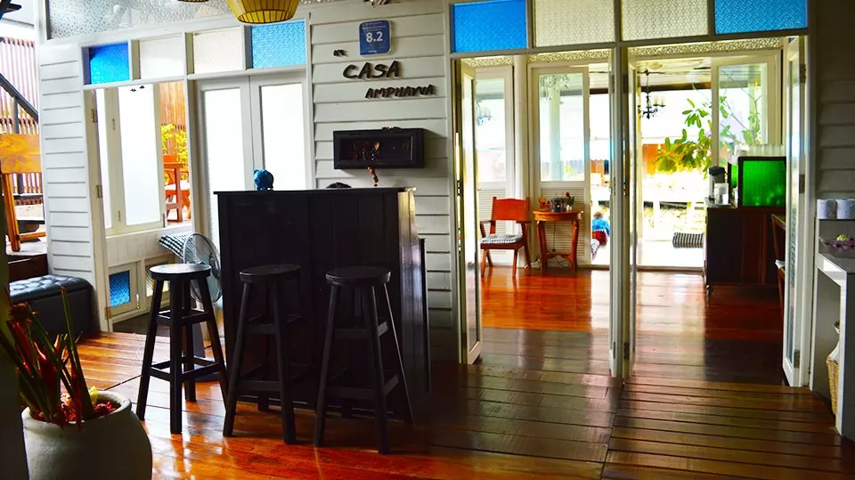 從資料搜尋中選定3星民宿「At Casa Guesthouse Amphawa」,在河畔,房間至少7.6坪,有提供SPA按摩、餐飲、單車出租等服務。上AGODA網站預訂1間雙人房(1晚700銖),下午2點到就可入住,放行李和休息一下,再進行其他行程。