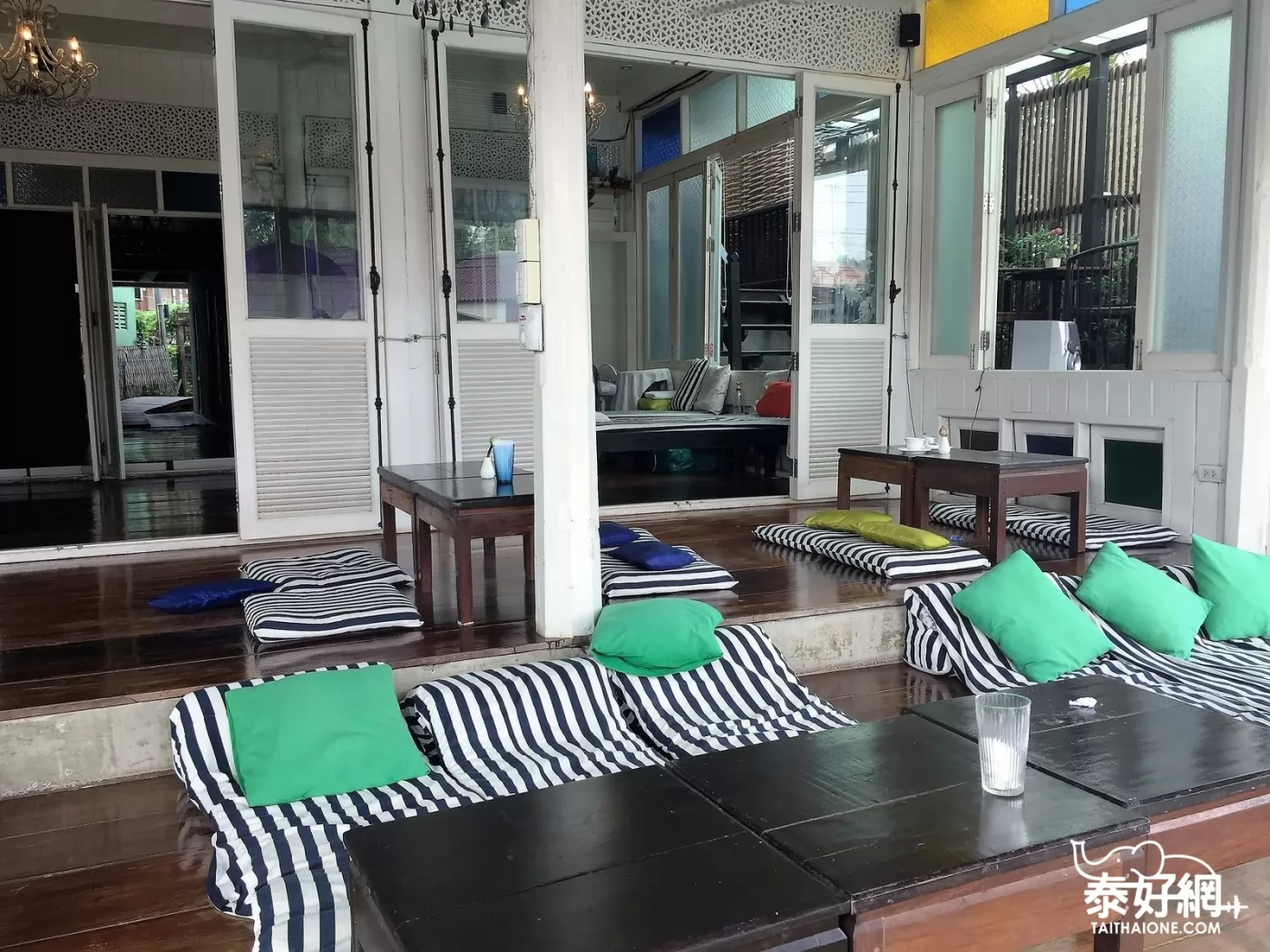 這家民宿位於水上市場的尾端,從熱鬧的水上市場走過來不到10分鐘,不過不好找,因為入口很小,得穿過狹窄的花園,才見到接待處。