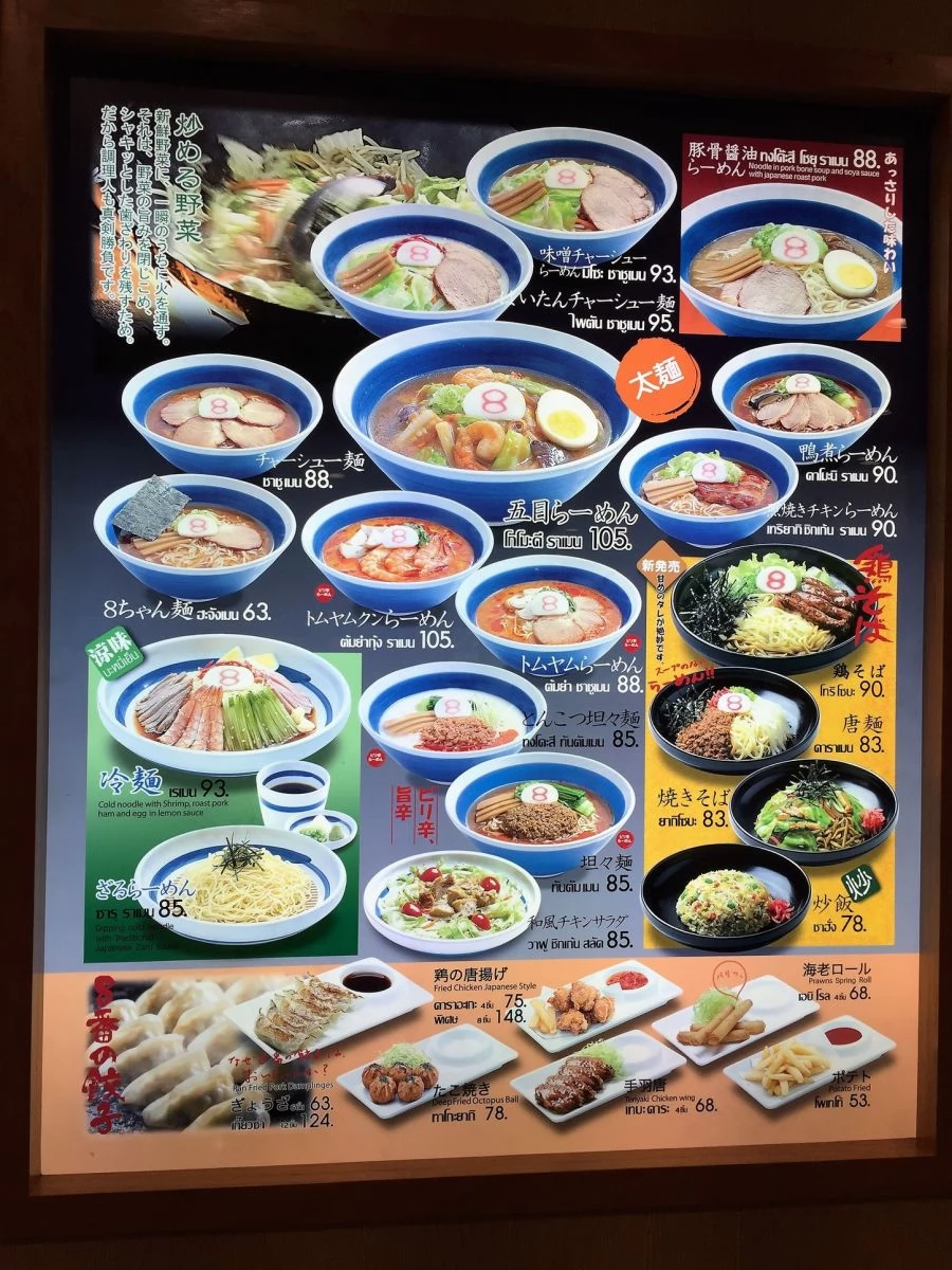 八番拉麵在各購物中心都有開設分店,MBK的1、2樓;CENTRAL WORLD對面BIG C超市的飲食區;西隆路上中央百貨公司的地下室;拉差達披色路上的BIG C;捷運ASOK站旁的TERMINAL21等都有分店。