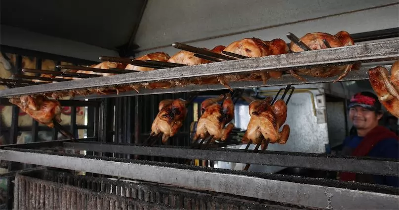 這裡的烤雞有別於一般將雞切半夾起來烤,是整隻挖掉內臟的雞放在爐上烤,烤爐的設計很特別,燒烤架會自動旋轉,在經驗豐富的店員掌控下,雞烤的金黃,勾引從店前走過的人的食慾,店家每天要售出數十隻烤雞。