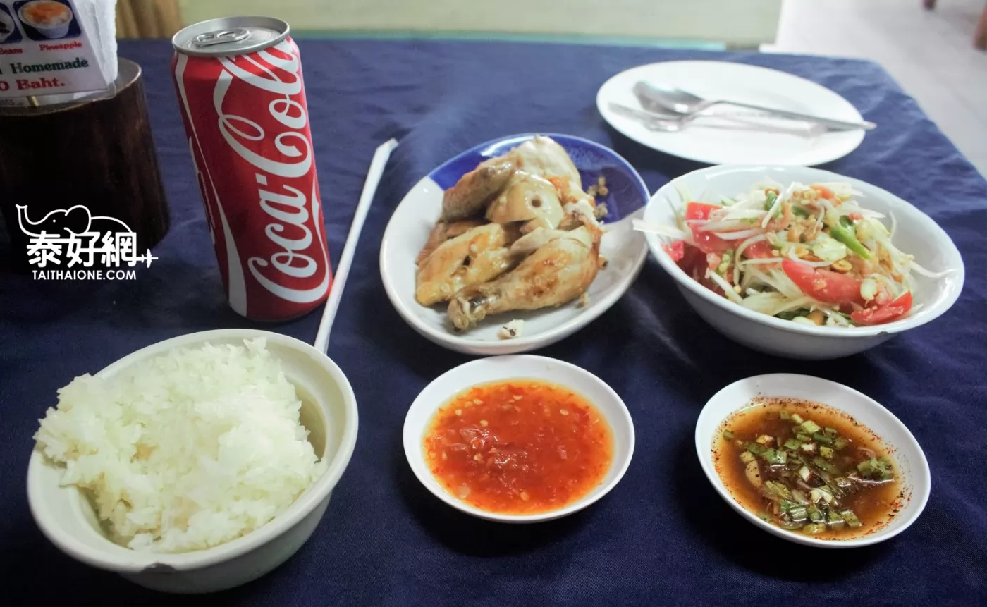 半隻烤雞(80銖)、泰式宋丹(40銖)、1碗糯米飯(10銖)、1瓶可樂(20銖),就痛快地吃了一餐!