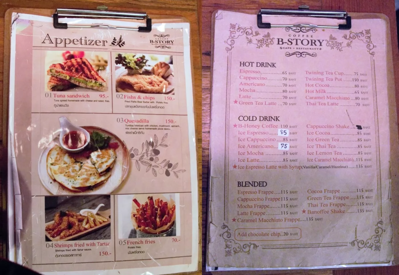 熱美式70銖、冰拿鐵85銖,最貴的茶點150銖,甜點也差不多在150銖以內。