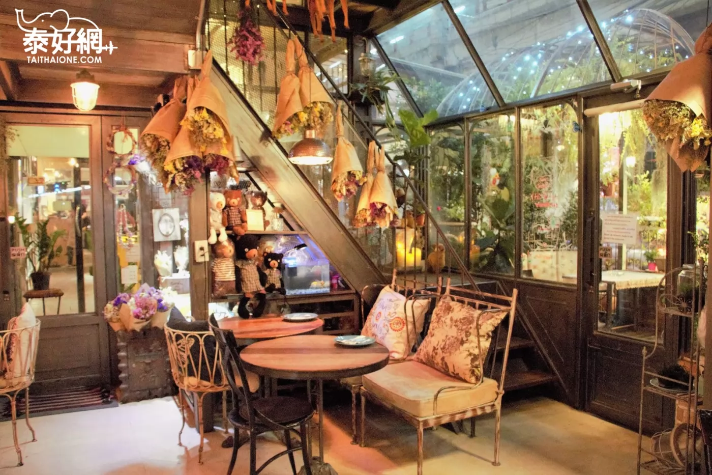 B-Story Cafe據說是由曾經的鄉村小教堂改建,整座咖啡館兩層式的結構以及外圍的歐式花園,從BTS的Ratchathewi站4號出口俯瞰視角中,成為最亮眼的存在,讓人忍不住要進去一觀的欲望。