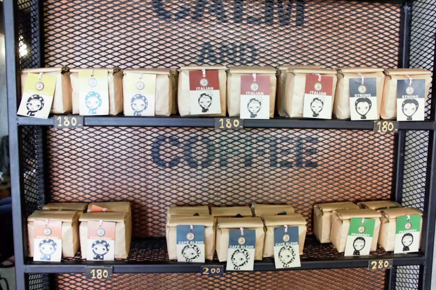店裡直接賣村民所種的各式咖啡豆,每包(大小不一)價格從150到320銖。