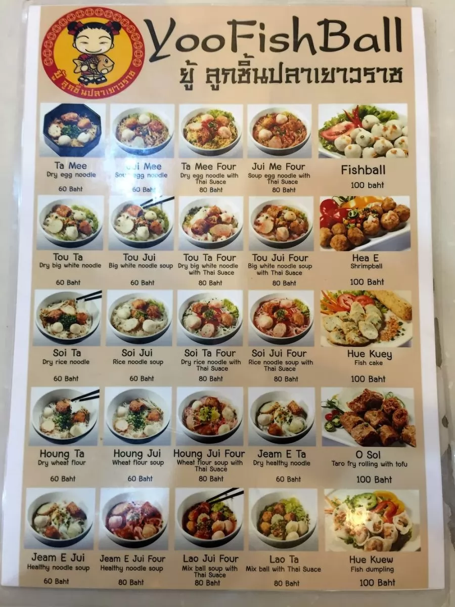 這是中國城裡1家以魚丸(Fishball)聞名的麵店,店主曾挑擔上街賣出名後,選擇開店,以老闆娘的名字Yoo作店名,Yoo Fishball(ยู้ลูกชิ้นปลาเยาวราช)。