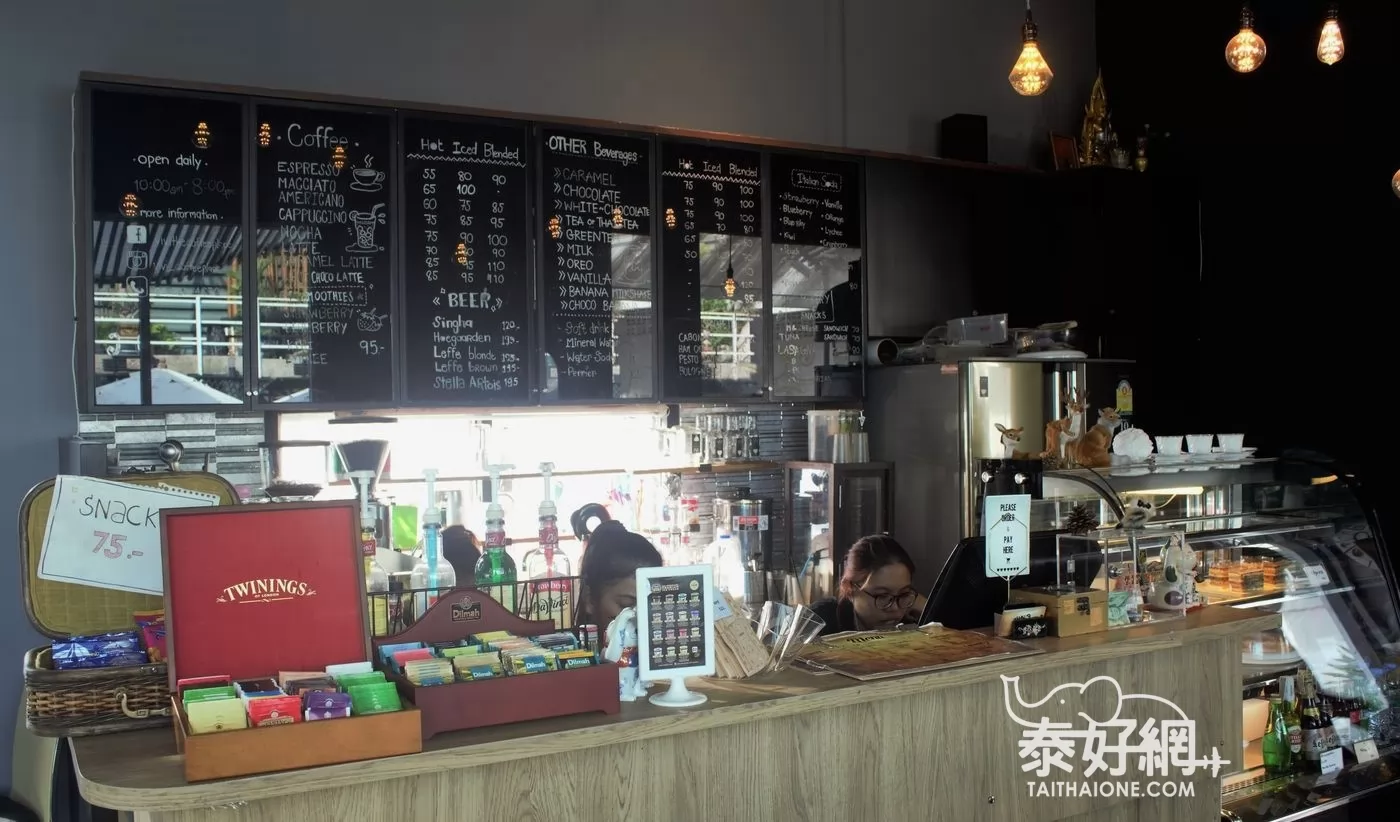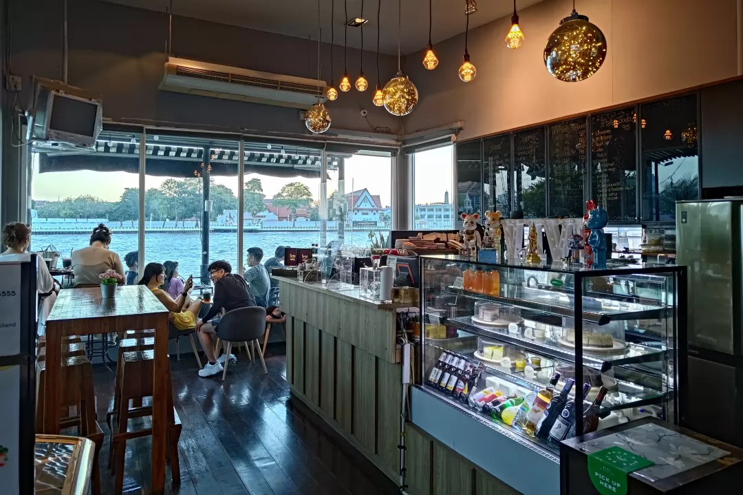 這間小咖啡店的位置相當好,臥佛寺對面馬哈拉(Maha Rat)路,第29巷的盡頭就是這家咖啡店,分成室內、外兩區,室外一邊是花園式的座位,另一邊則是距離河邊不到10公尺,不會有人妨礙你看河景,或是搶著拍照。