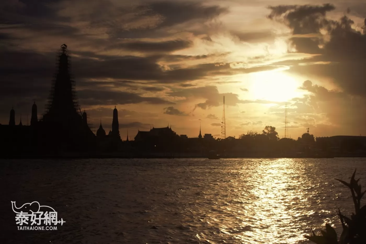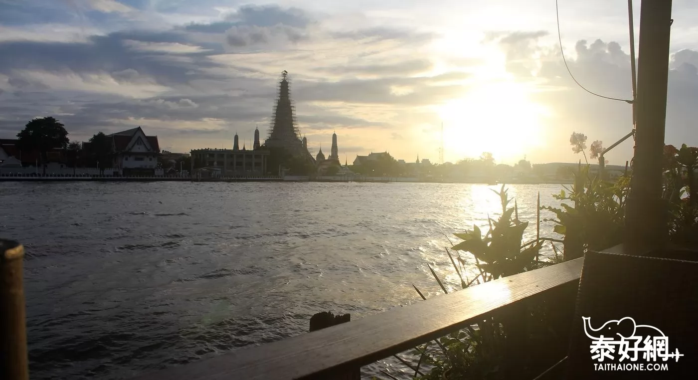迎著湄南河吹來涼爽的風,襯著夕陽灑在河面閃爍的金光,遠遠的豎立的鄭王廟,河上穿梭而過的船隻、快艇、貨輪,這美景讓情侶不用言語,心心相印在一起。