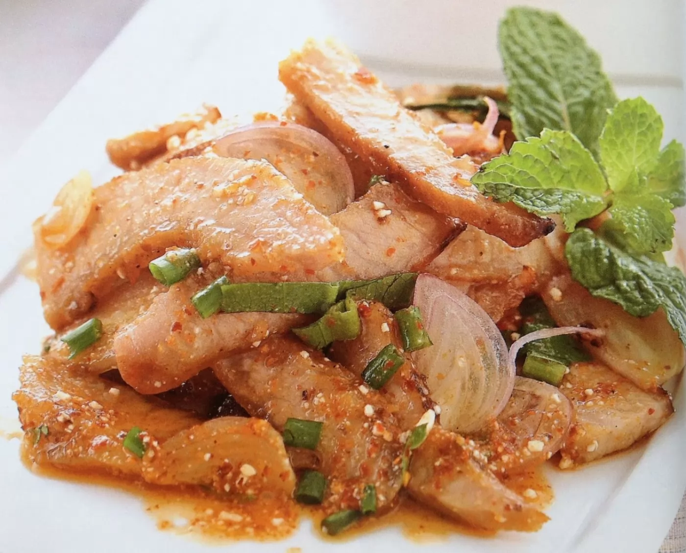 涼拌酸辣豬肉片,泰文稱為น้ำตกหมู,也是很具東北特色的一道泰國名菜,在曼谷的東北餐廳裡不難找到這道菜。