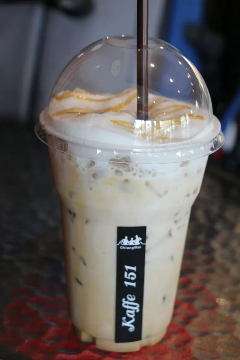 這裡的咖啡也不錯喝,因為搽採用的是DOI CHAANG(泰北有機阿拉比卡咖啡豆),價格是合理的,一杯熱拿鐵60銖,冰拿鐵70銖。