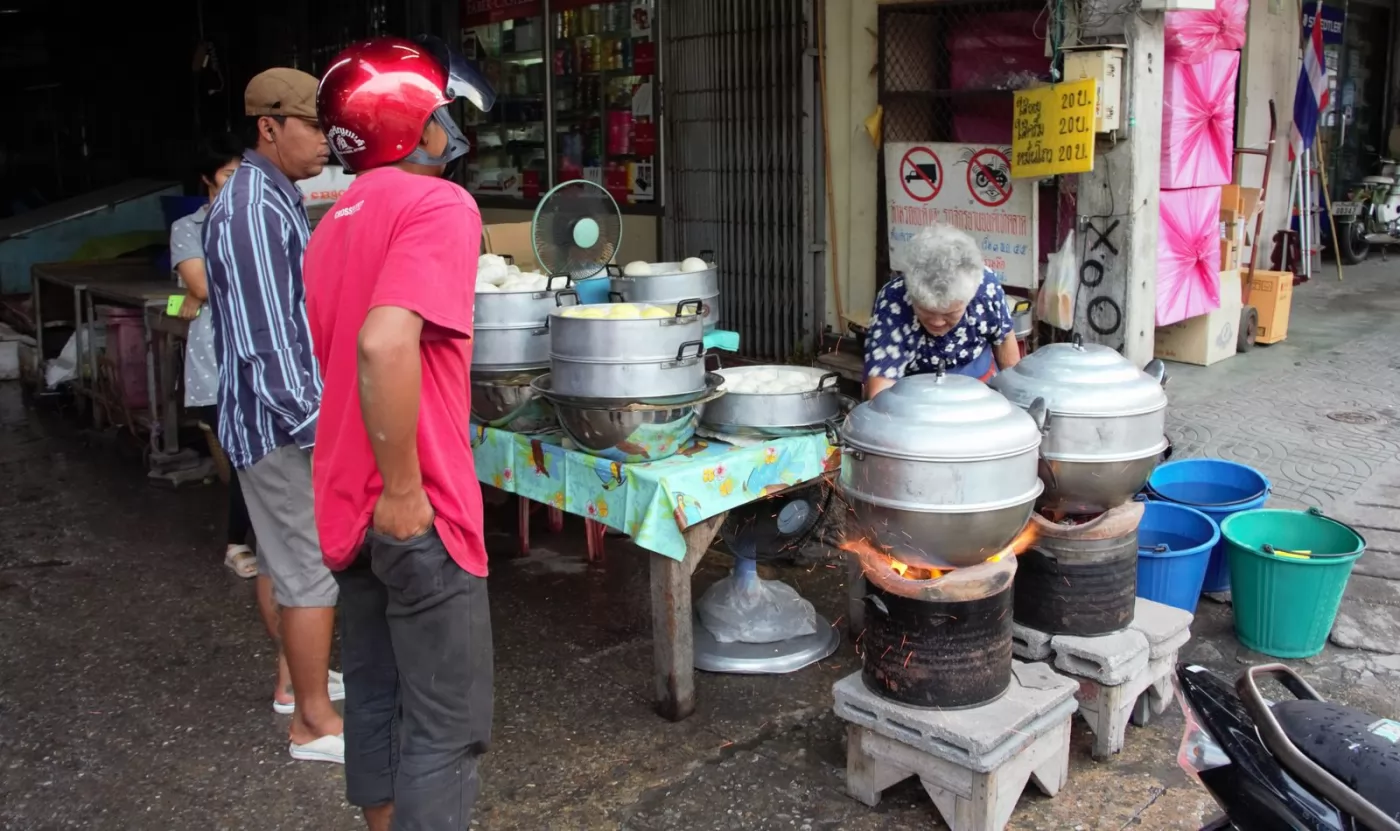 華欣當地人大都知道老阿婆(ม่วย)在賣沙拉包(ซาลาเปาเตาถ่าน),泰國網站也介紹過她賣的沙拉包(名列華欣10大路邊小吃)。只要下午5點她來擺攤,人潮就源源不斷,她一個人忙碌著,添加炭火、沙拉包、饅頭;剪保麗龍盒子裝沙拉包;算錢;找錢,她的記性很好,誰先來後到都記得,不會出錯,因此大家都有耐心的排隊購買,然後提著大包、小包的沙拉包離開。