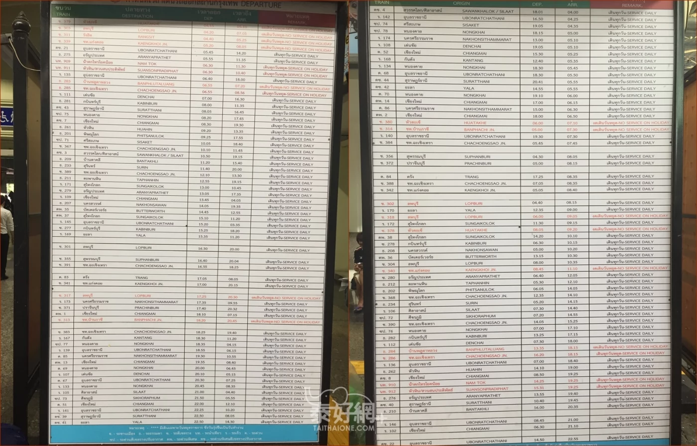 曼谷火車站有著拱園圓形的歐式外觀建築物,泰國鐵路網的心臟,國內外列車都以這裡為起迄站,每天承接上萬旅客。北線行至南邦、清邁;南線可經北海到新加坡;東線行至亞蘭(Aranya Prathet),近柬埔寨邊境;東北線至廊開(Nong Khai),近寮國邊境。