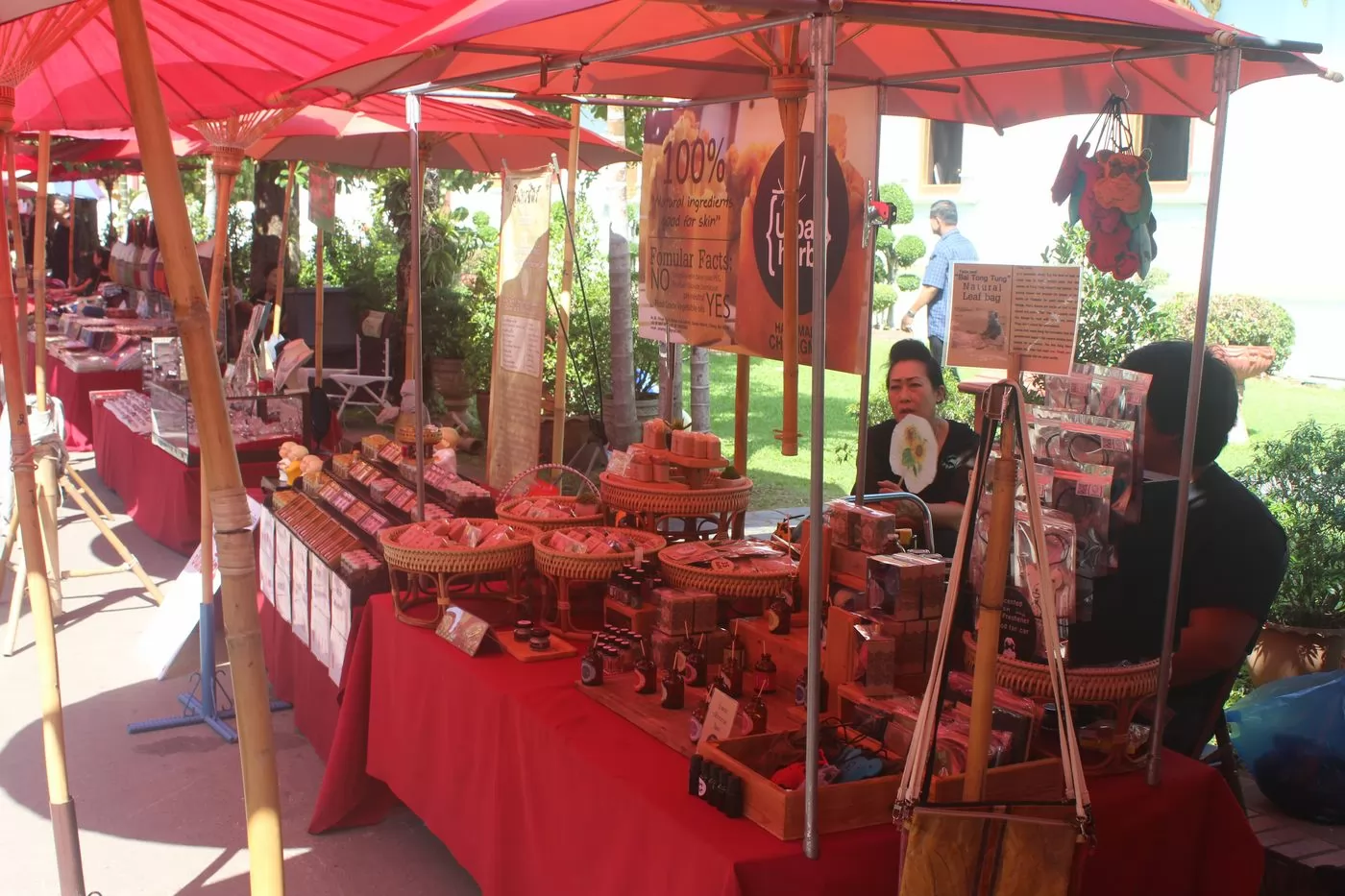 每周末,主寺旁撑起蘭納紅傘的小市集,不大但有得吃有得買。