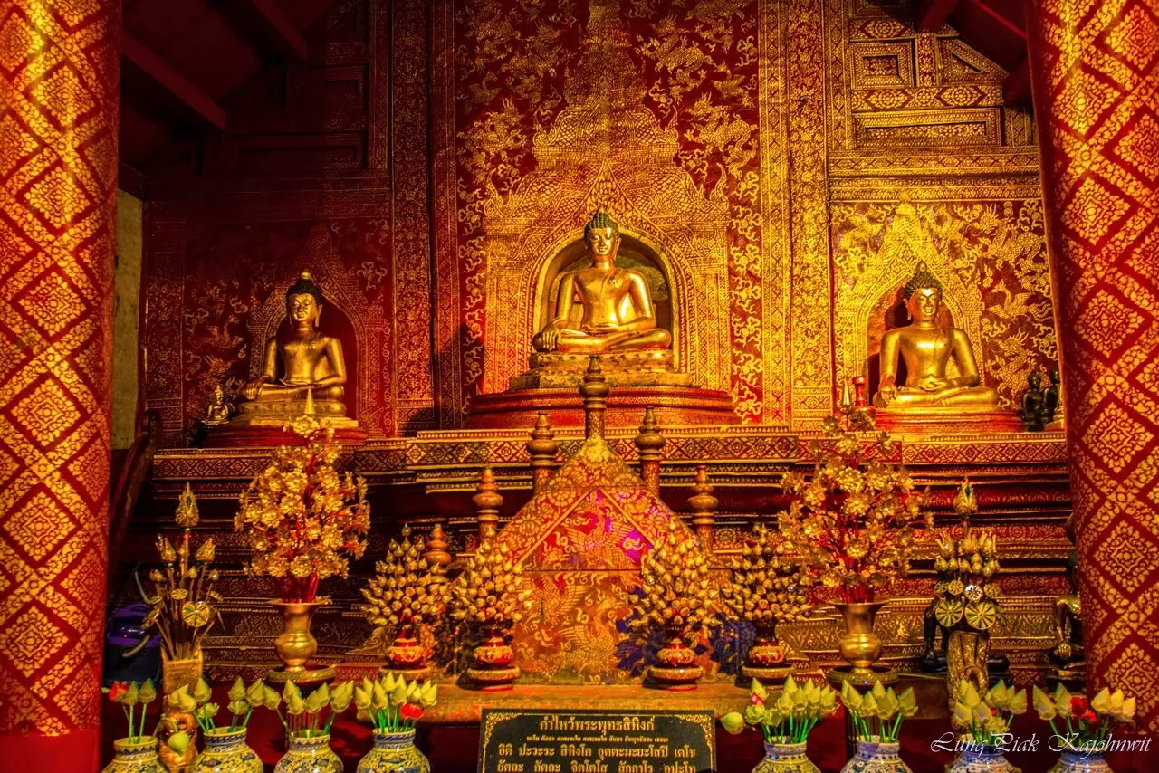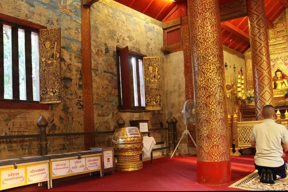 來康佛殿(Lai Kham),木雕及壁畫非常地細膩精緻,相傅是由當地一位名為傑衫(Jek Seng)所畫,內容多是佛教各派所流傳關於釋迦牟尼在世事蹟的通俗故事情節、以及對泰北人日常生活的生動描寫,是清邁保存最好的佛寺,被譽為泰國建築的精華,很值得進來好好賞析一番。