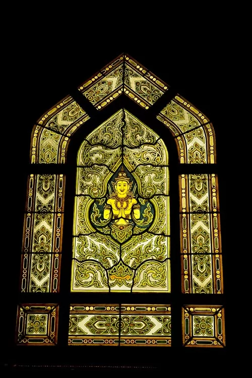 佛殿窗戶仿歌德式建築風格,用彩色玻璃拼成泰式佛像圖案。