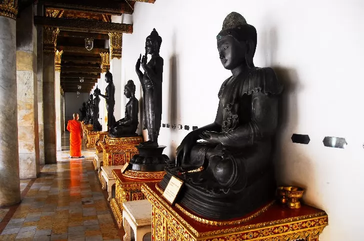 主殿外是大理石庭院,走廊上陳列著52尊泰國歷代各時期的各種類型的青銅佛像,呈現出不同的手印,融合了中國、印度等佛教造型藝術風格,是泰國佛寺建築中最富西方色彩風格的寺廟,被視為19世紀佛教雕刻的典範。