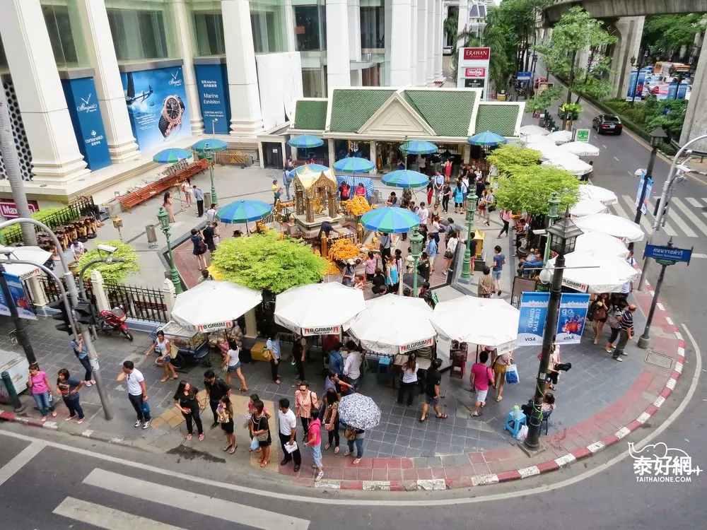 四面佛位於凱悅(Erawan Grand Hyatt)酒店的路角上,SOGO百貨公司的門前,GAYSORN百貨公司對面。