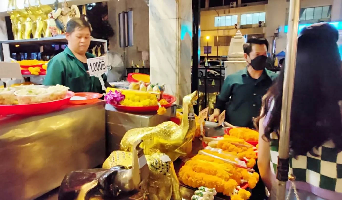 寺廟外,有些攤販出售關在小籠子的小鳥,許願者若是買下將小鳥放生,就可以做功德。另外,一般泰國人也相信,這附近殘障小販出售的彩劵,會特別幸運。
