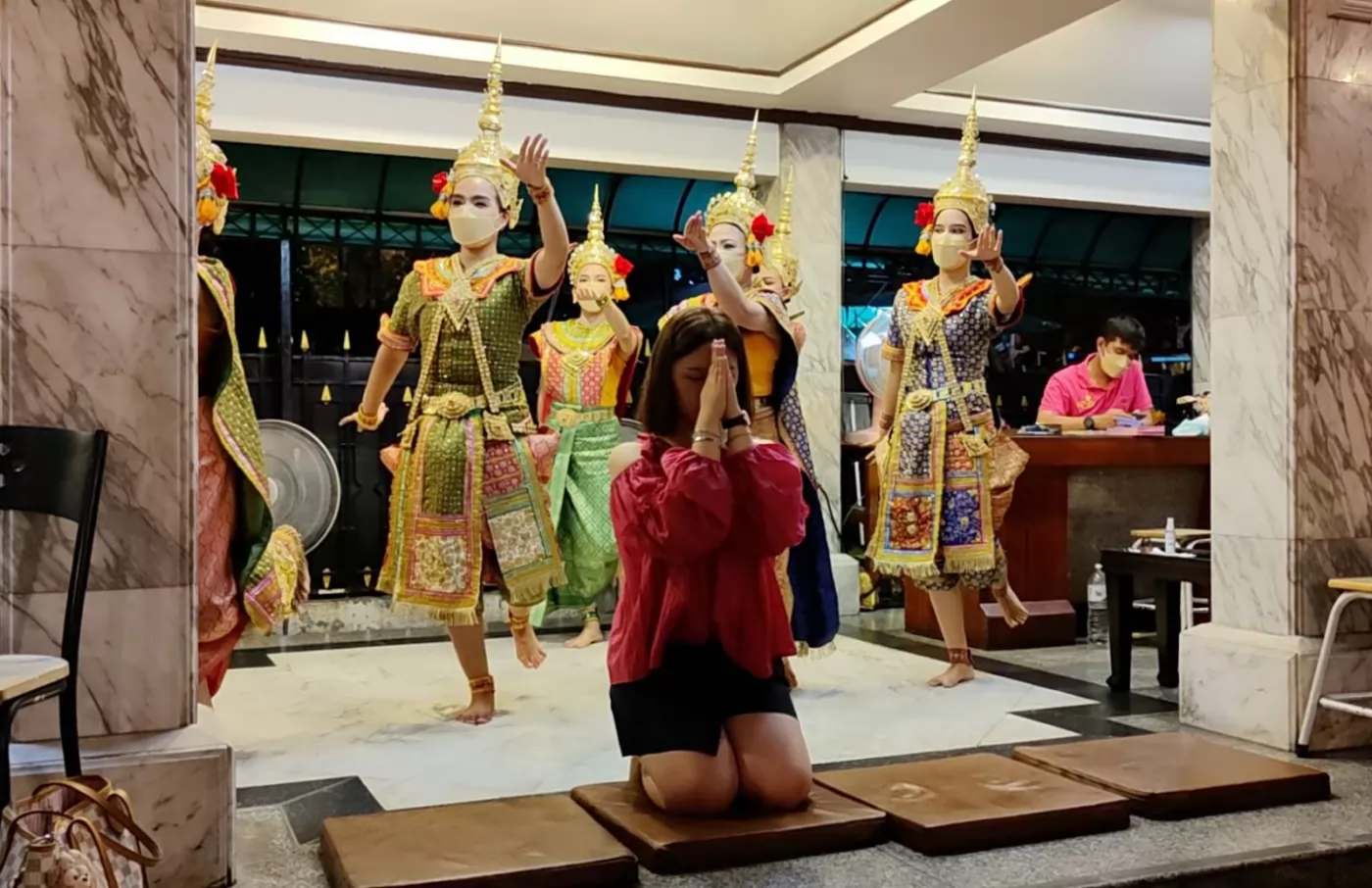如果要還願得隆重些,一般都會跳還願舞來酬謝。穿著泰國的古代民族服裝少女隨著音樂邊歌邊舞,她們是在為眾多善男信女跳「還願舞」,費用以人頭計算。